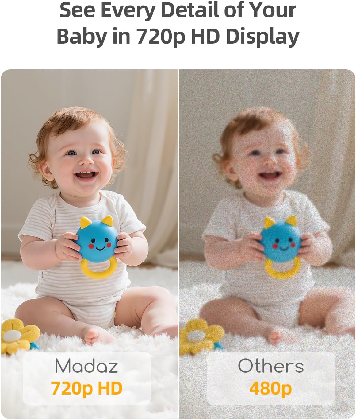 [Crystal-Clear Two-Way Audio] – Talk & Listen in Real Time: The Madaz baby monitor with camera and audio features built-in, crystal-clear two-way audio, letting you communicate with your baby anytime. Whether you’re in another room or on a different floor, your voice reaches your baby instantly – soothing your baby or checking in without entering the room.