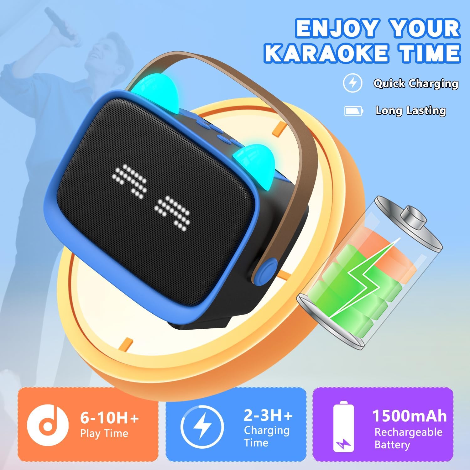 Upgraded Interactive Emoji & Light Show: Multi-color LED lights on the speaker body sync with music rhythms, creating a vibrant visual experience that enchants kids and enhances singing excitement.