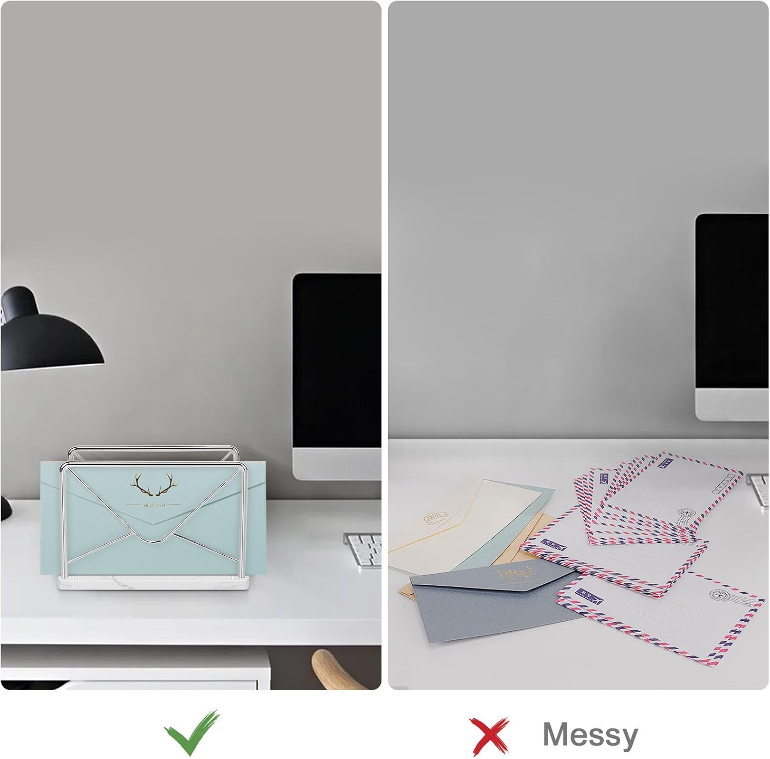 In comparison to scattering envelopes on the desk, placing them on the marble envelope holder creates a clean and organized appearance. The design provides a clear place for documents, contributing to a visually appealing and orderly workspace.