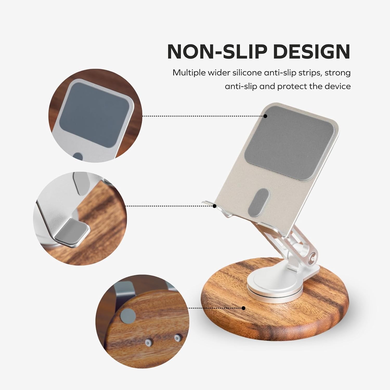 muso wood Cell Phone Stand for Desk, Foldable 360 Rotating Cell iPhone Holder with Acacia Base, Adjustable Travel Cell Phone Mobile Stand for All Smartphones, iPhones, IPads