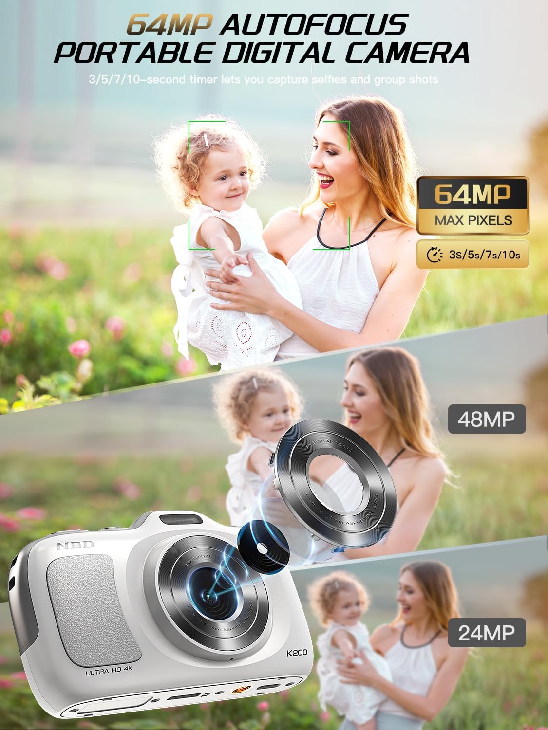 NBD 64MP Digital Cameras for Photography,4K Point and Shoot Camera,16X Zoom Compact Travel Cameras, Auto Focus Camera for Beginners Teens Kids and Lover Gift,Includes 32GB TF Card (White)