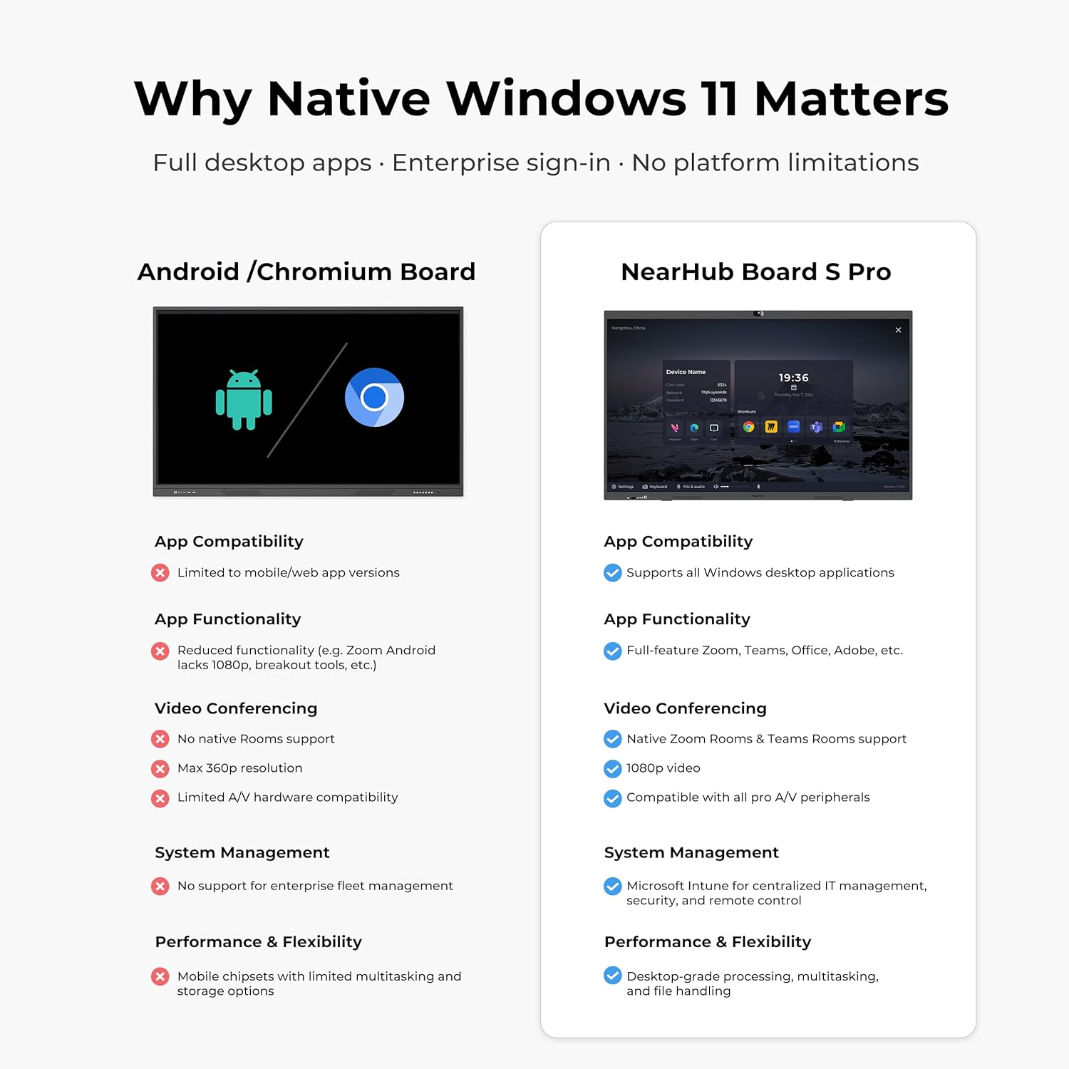 Enterprise Security & Centralized IT Management withMicrosoft Intune :Protect your organization with remote configuration, device enrollment and update management via MicrosoftIntune. Support SSO solutions such as MicrosoftAzure AD and Okta, enabling granular control over user access, apps and data—ensuring compliance, security and scalable deployment across offices, classrooms and conference rooms.