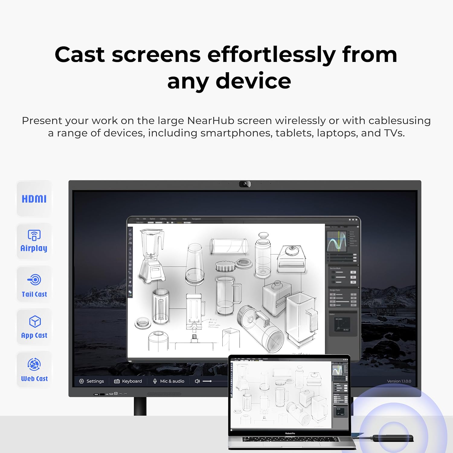 Wired & Wireless Screen Sharing with Real-Time Collaboration:Share content instantly from laptops, tablets or smartphones via AirPlay, HDMI, Tail Cast or App Cast. Collaborate in real time using the NearHub Whiteboard, web browsers or mobile devices, and enhance discussions with annotations, comments and stickers. All content is automatically saved to the cloud—no more lost ideas or manual exports.