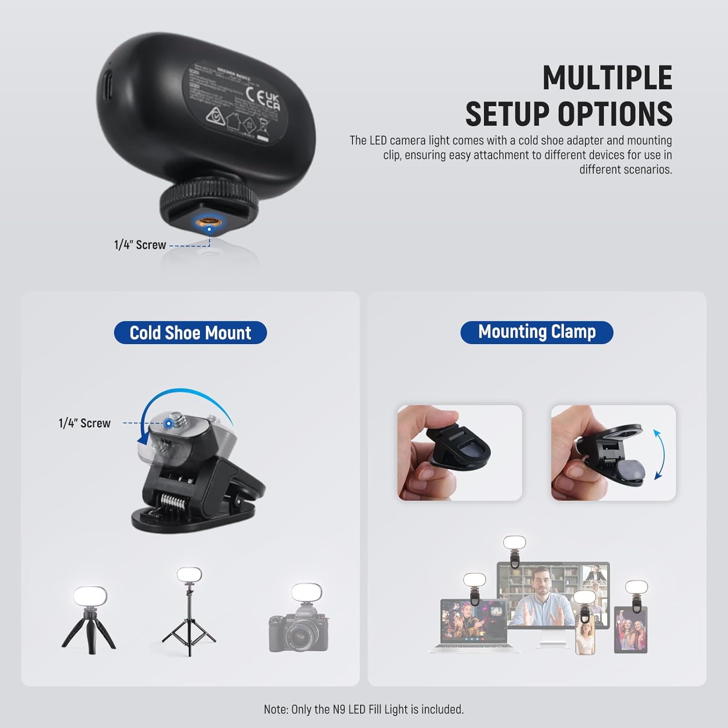 【Cold Shoe & Clip Mount Included】 The LED camera light comes with a cold shoe adapter and a mounting clip for cameras, phones, tablets, laptops, and desktop monitors up to 1″/2.5cm thick. Easily fulfill your lighting needs across different scenarios. Compatible with iPhone 16 15 14 12 11 Pro Max iPad Pro Galaxy S23+ S24 Ultra MacBook Air as content creator essential photography gear, makeup artist, streamer and influencer must have for overhead pictures, filming and video recording