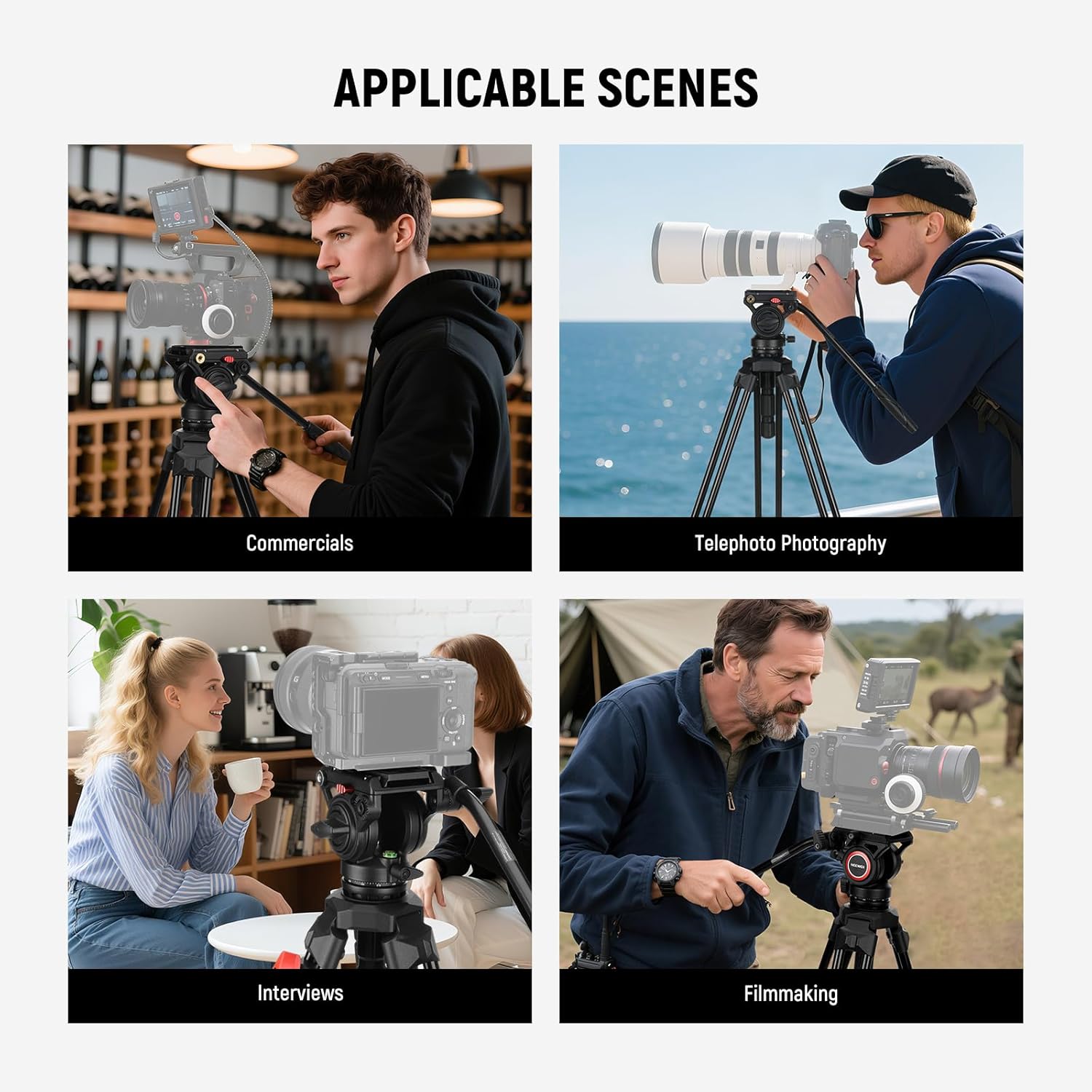【Premium Fluid Drag Pan Head】 The video tripod features a fluid drag pan head, offers smooth friction damping, and supports 360° rotation with a tilt range of -75° to +90°, with a detachable handle for both left and right handed use. Its 75mm bowl base comes with a 360° scale for capturing sharp panoramic images, and includes a leveling handle and a built in bubble level for rapid leveling. The fluid head is also removable for other tripods with a 75mm base diameter