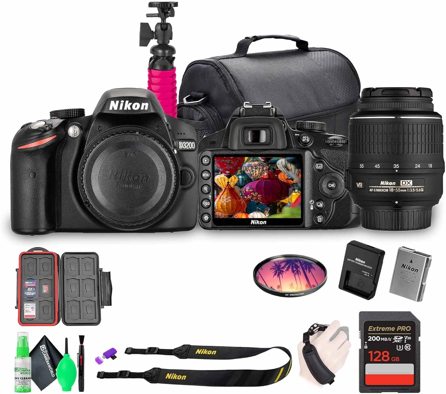 Bundle Items Include: Nikon D3200 DSLR Camera with 18-55mm Lens + 128GB Memory Card + Camera Bag + USB Card Reader + Protective Memory Card Case + 52mm UV Filter + Flexible Tripod + Hand Strap + Cleaning Kit