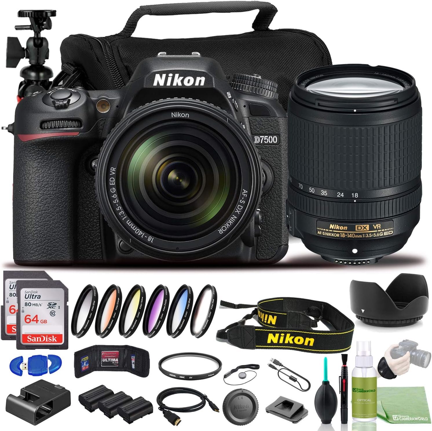 Bundle Includes: 1 x Nikon D7500 DSLR Camera with 18-140mm Lens, 1 x 67mm Graduated Color Multicoated 6pcs Filter Set, 2 x EN-EL15 Lithium-Ion Battery Pack, 2 x SanDisk Ultra SDHC/SDXC UHS-I Card 64GB, 1 x Large Padded Case, 1 x Memory Card Wallet, 1 x 12 Inch Flexible Tripod, 1 x Deluxe Cleaning Set, 1 x High Speed Mini HDMI to HDMI Cable, 1 x Professional UV Filter – 67mm, 1 x Hand Strap, 1 x Lens Cap Keeper ,and More…..