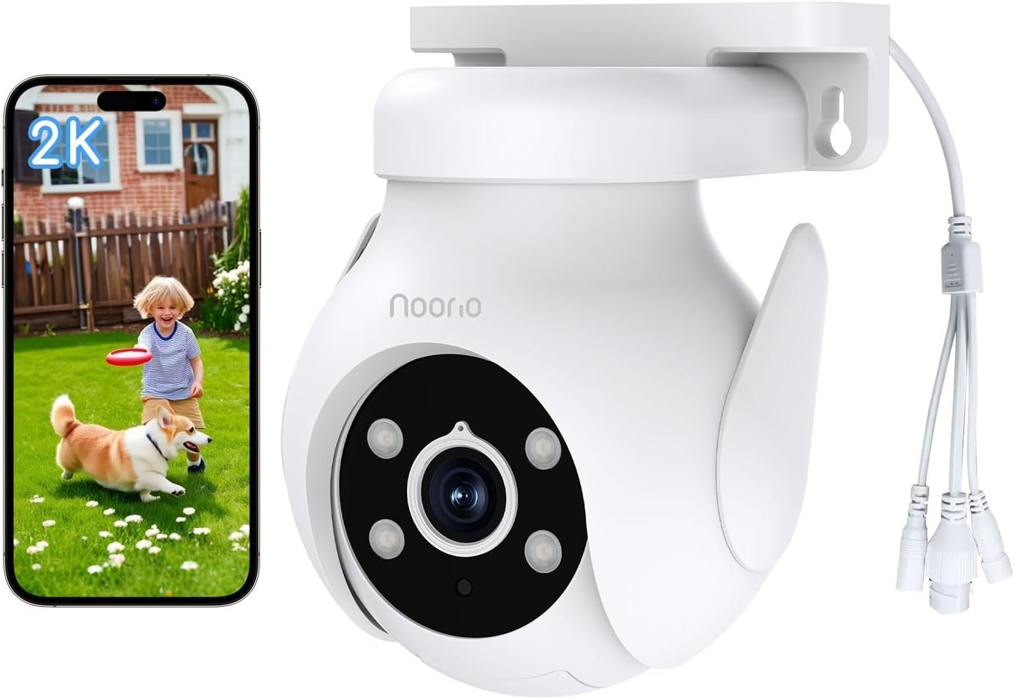 Noorio 2K Security Camera Outdoor 360° Pan/Tilt, Two Way Talk Wired Outdoor Camera for Home Surveillance, 24/7 Recording, Color Night Vision, Cloud & SD Card Storage, Compatible with Alexa, 2.4G WiFi
