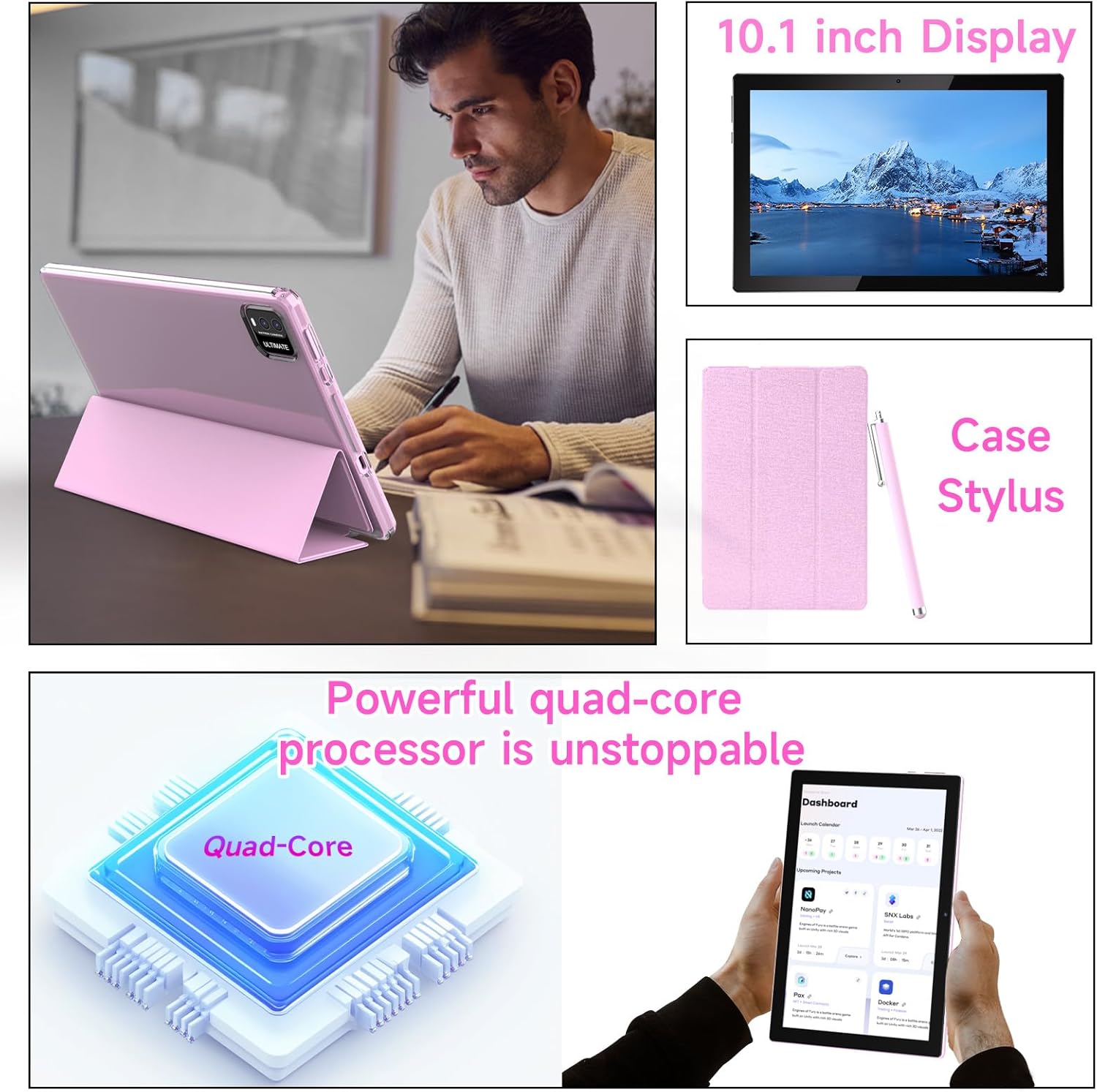 NOVOJOY Tablet 10 Inch Android Tablets with Case and Stylus Android 15 Tablet with Cover 2MP+8MP Dual Camera 6000mAh Battery 12GB RAM(4GB+8GB Expansion) 64GB ROM 5Gwifi-6 10.1″ Tablets (Pink)