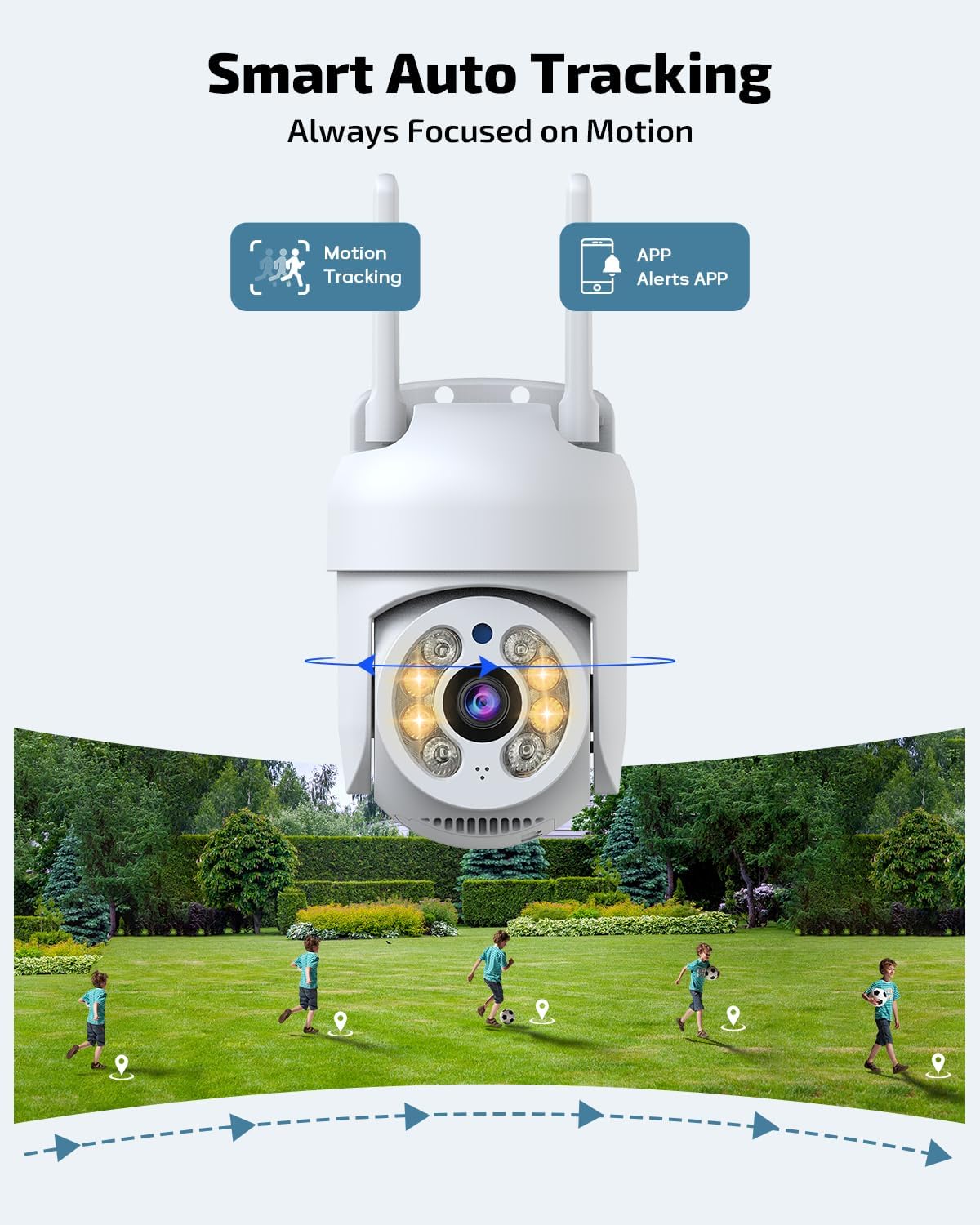 《Auto-Tracking》Remotely pan and tilt your WiFi security camera via the mobile app to cover every angle and reduce blind spots. The built-in auto-tracking feature automatically follows moving people, ensuring you never miss important activity—perfect for front doors, yards, driveways, garages, and indoor spaces.