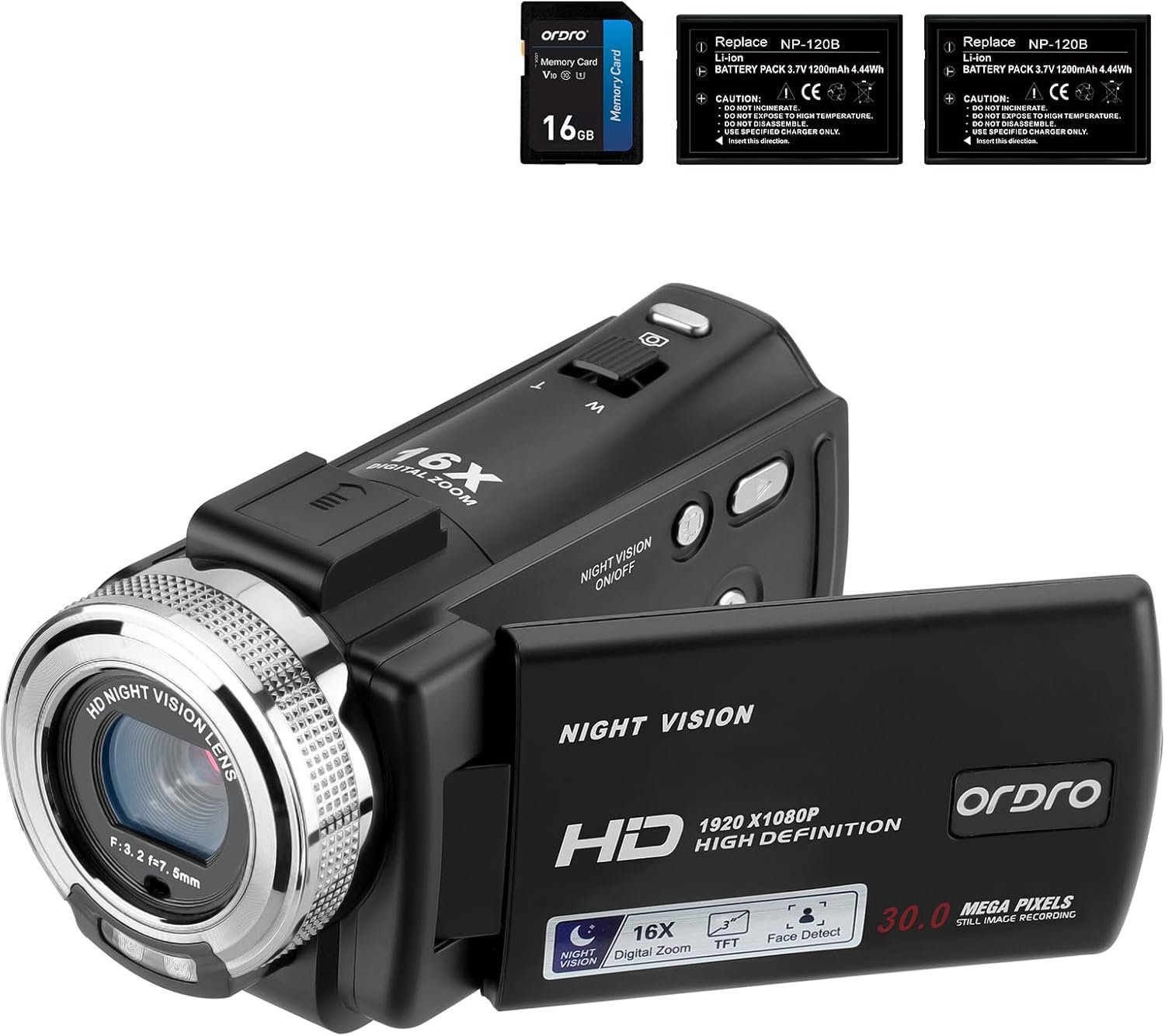 ORDRO HDV-V12 Video Camera Full HD Camcorder Digital Recorder | 1080P 30FPS 30MP | 3.0 Inch Rotation LCD | 16X Digital Zoom | Infrared Night Vision – Black (V12+16GB Card)