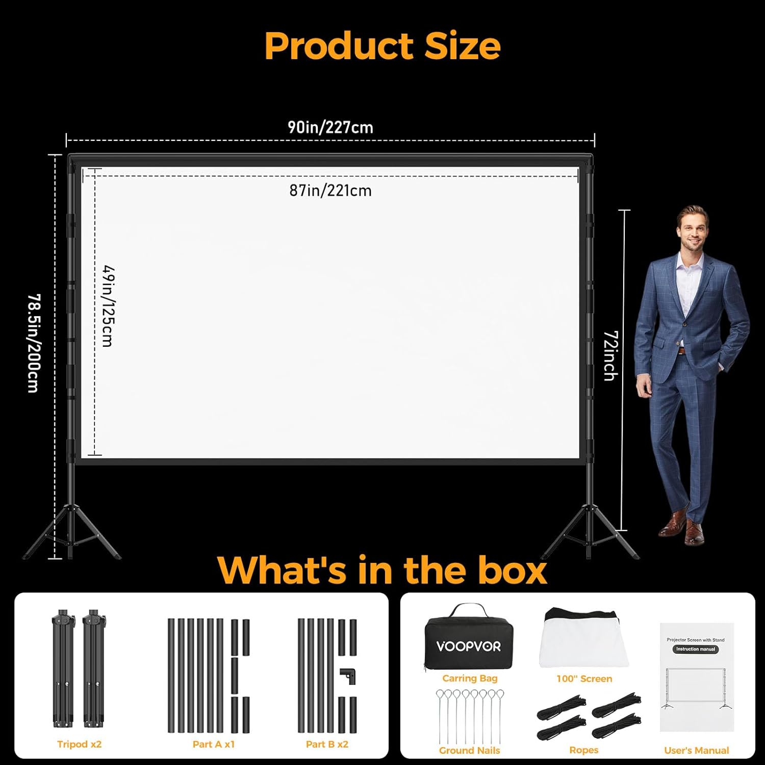 【Buy With Confidence】: Add the VOOPVOR outdoor projector screen to your cart now! You will receive: 100-inch wrinkle-resistant projection screen x1, Part A (crossbars x6, connectors x5, 90° rope connectors x2) , B Components x2 (Horizontal Bars x8, Connectors x8), Square Tube Tripod Stands x2, Windproof Ropes x4, Ground Pegs x8, Portable Bag x1. VOOPVOR aims to provide every customer with a satisfying user experience, offering product warranties and lifetime after-sales service. If you encounter any difficulties during use, please contact us, and we will provide you with a solution!