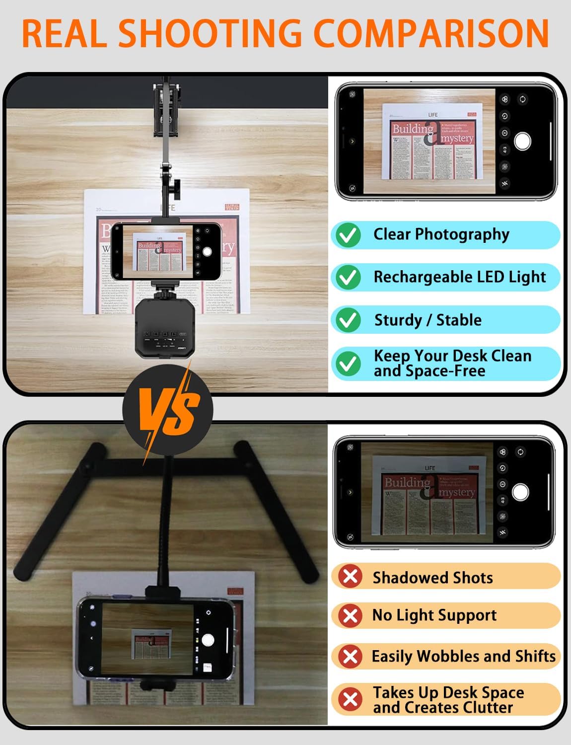 【More clear and Bright】The overhead phone mount is equipped with an led light, which has 3 modes and 10 adjustable brightness, provide proper but sufficient light for different occasions. Warm tips: This product is only suitable for providing supplemental lighting during photography, video recording, and more. It is not phone projection