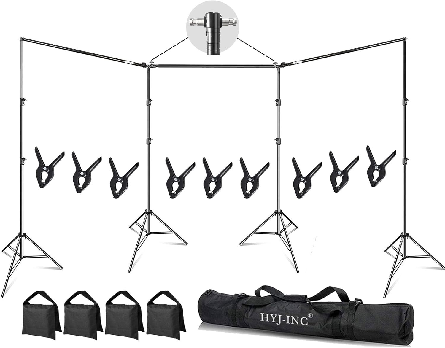 (9)x 4.5″ Photography Muslin Backdrop Clamps,Maximum opening 2.1″ fit onto most backdrop stand, background,photo studio.(4)x Sandbags Help to add weighted for stable in outdoor conditions.The bag is empty and can be filled with any material that can add weight.(1)x Portable Carry Bag: premium quality nylon material with sturdy zipper everything disassembles back into the bag, easy to store or travel with.
