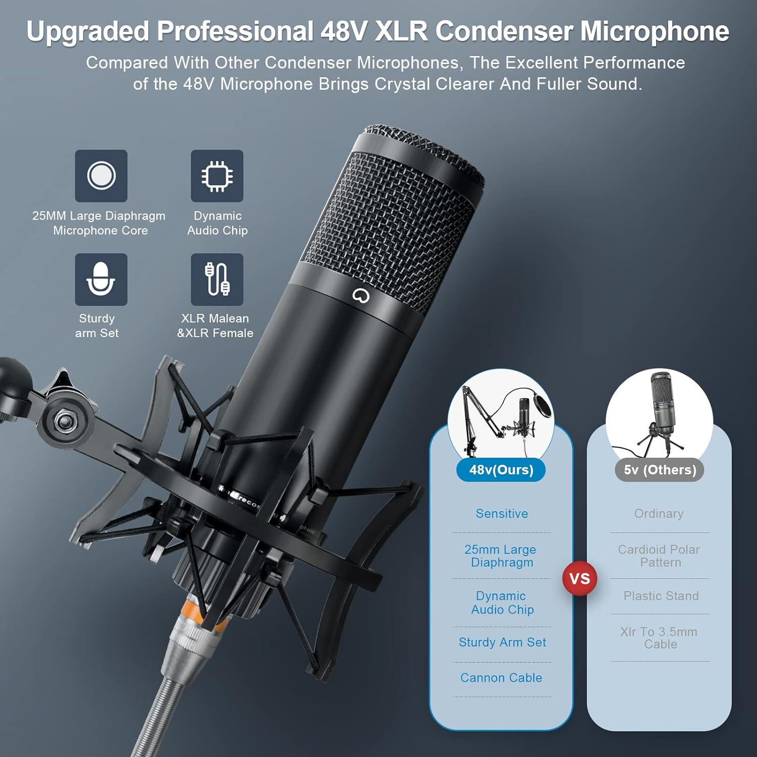 【Package List】 Microphone, Audio Mixer, User Manual, XLR Male head to XLR female head mic cable, USB to Type C charging cable,2* 3.5mm TRRS audio cable, Mic Suspension Boom Scissor Arm, 3.5 mm Earphone, Mic Shock Mount,We provide a 12-Month warranty. For a better user experience, please download more instructions below and read the user manual before setting up.