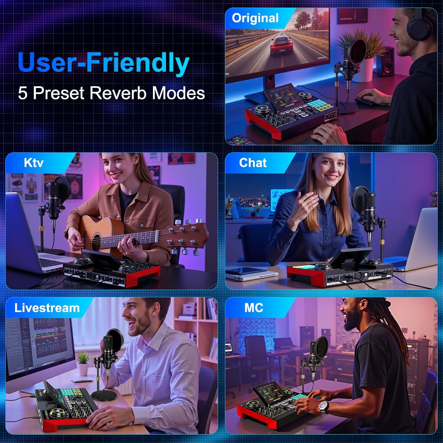 The G10 Professional DJ & Podcast Equipment delivers a complete DJ setup and recording solution, allowing seamless mixing of sound sources without complex configurations. Perfect for DJ performances, live streaming, and podcasting, this DJ gear enables you to: ✔ Mix microphone inputs like a pro—ideal for DJ hosting, MCing, and vocal effects,✔ Optimize and modulate your voice with real-time effects for DJ drops, radio-style transitions, and dynamic podcasting.