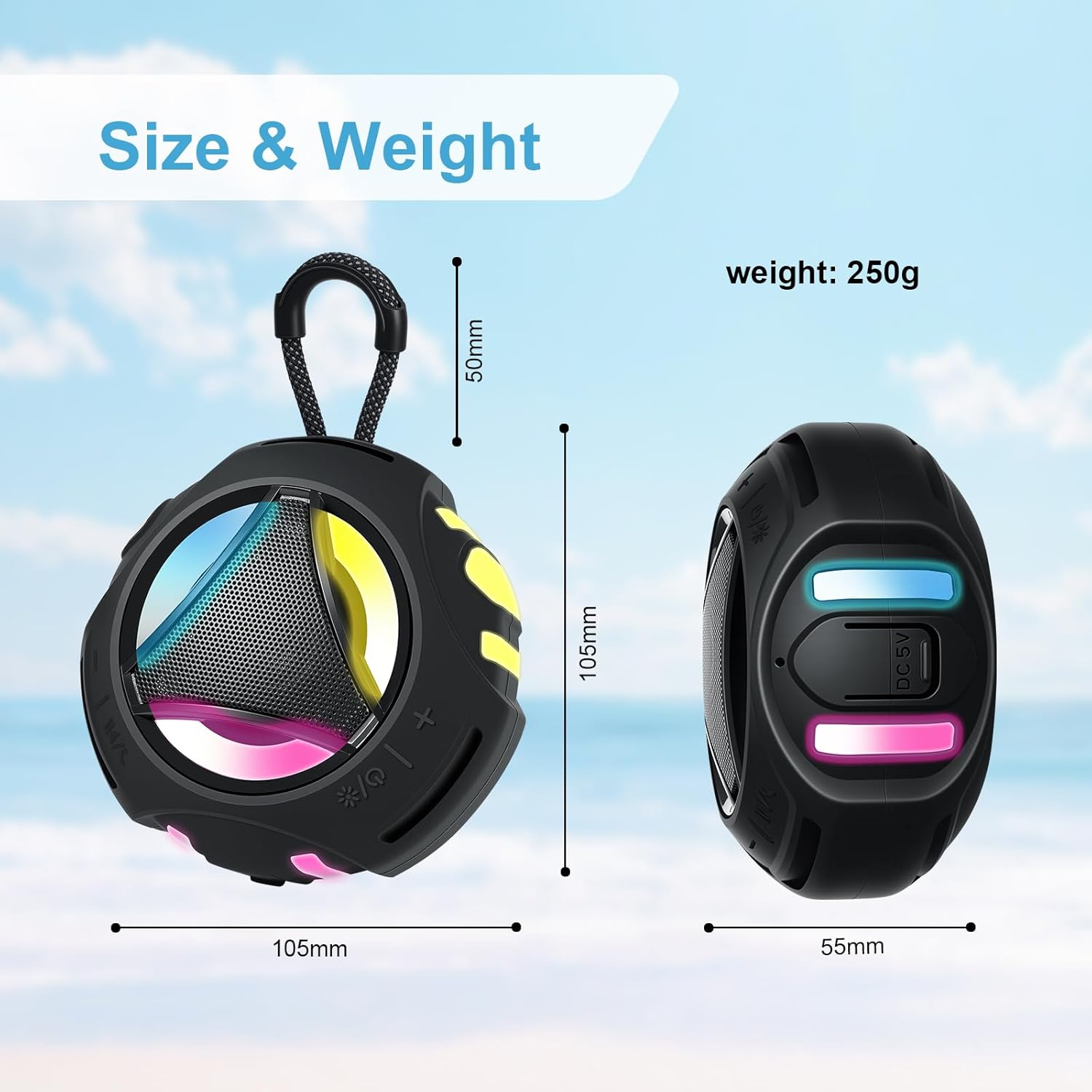Portable Bluetooth Speaker, IPX7 Waterproof Shower Speaker, Wireless Outdoor Speakers, Floating, Built-in Mic, 24H Playtime with LED Lights, Loud HD Sound, Powerful Bass, Gifts for Unisex – Black