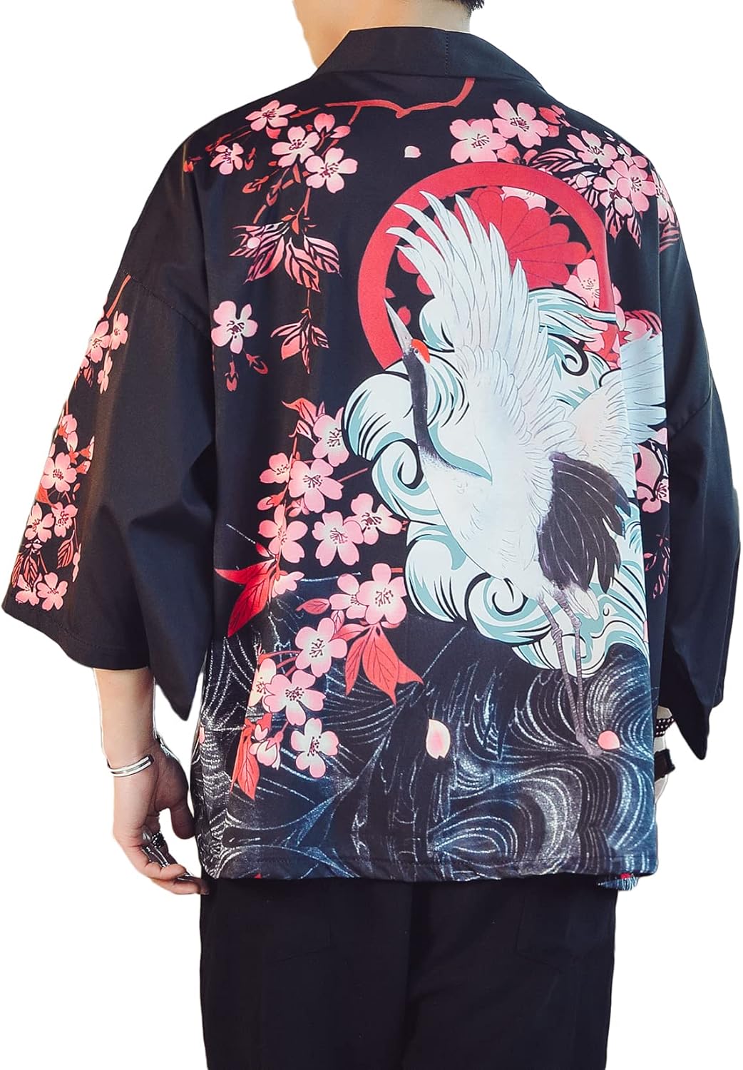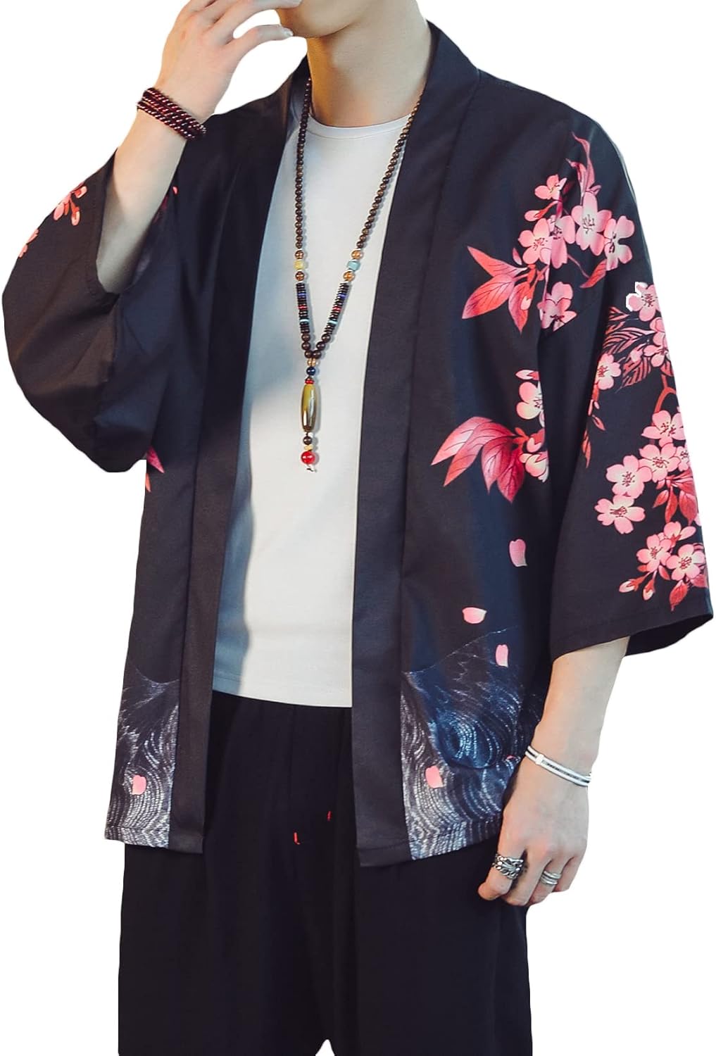 PRIJOUHE Men’s Lightweight Kimono Jacket Seven Sleeve Open Front Cardigan Coat Japanese Style Bathrobe