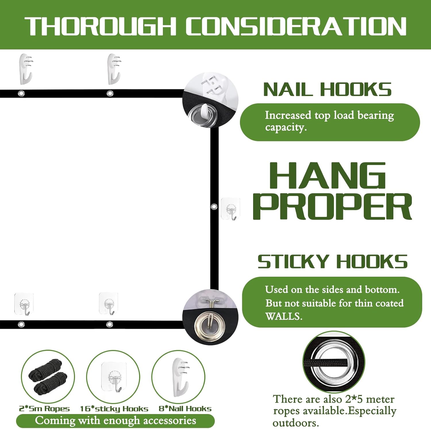 Coming with 8 x nail hooks / 16 x sticky hooks / 2 x 5 meters rope / Projector screen / Storage Bag