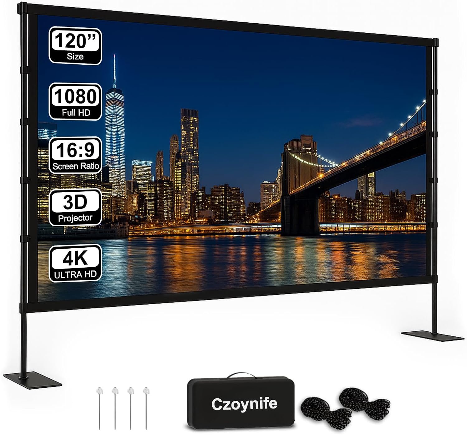 Projector Screen with Stand – 120inch Outdoor Projector Screen Portable, 16:9 Indoor Movie Screen, 4K HD, 3D Compatible Includes Carry Bag