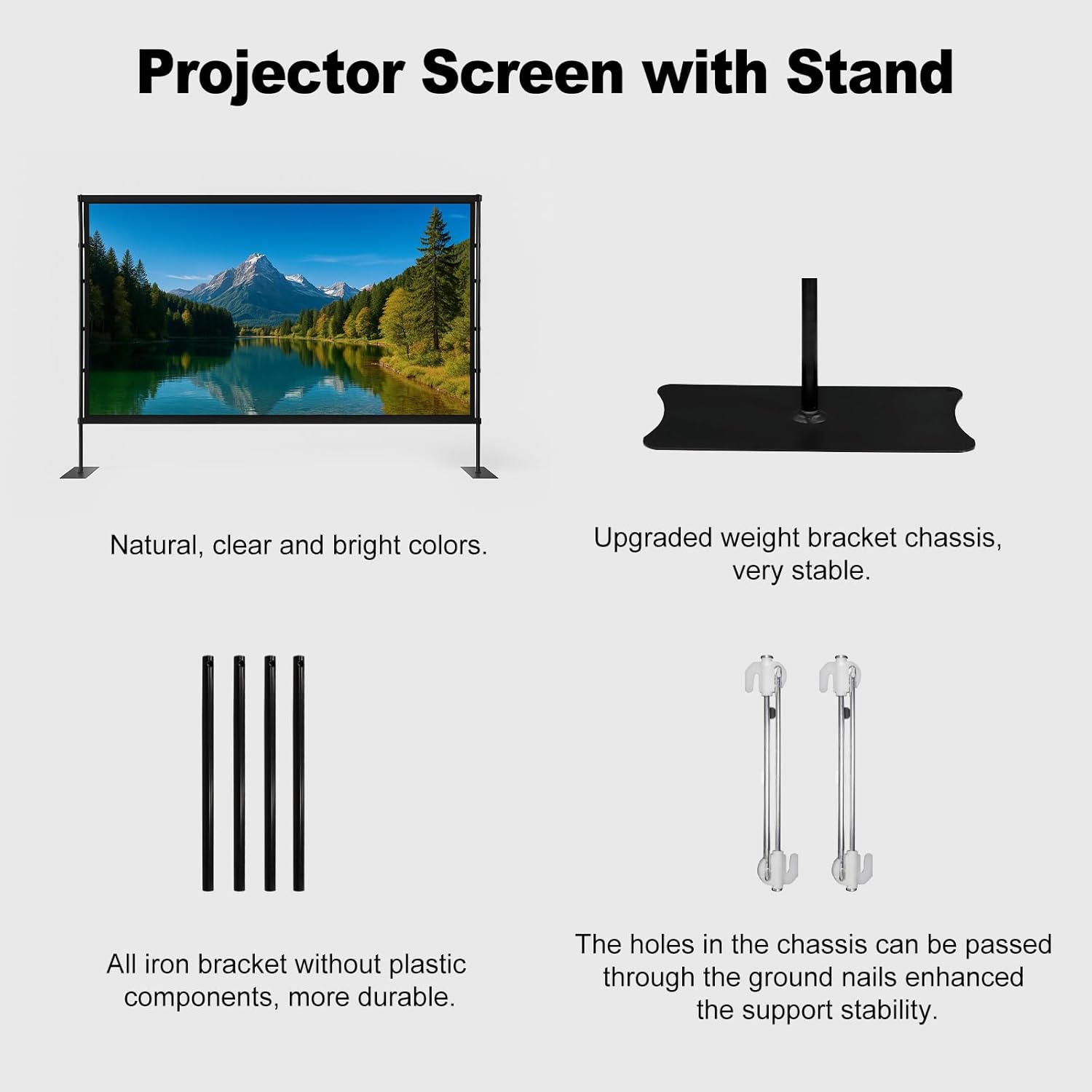FEATURES: To enhance stability and elevate your user experience, we’ve updated the projection screen with key improvements. These include a reinforced chassis and dedicated accessories, along with an extended chassis length and increased weight for better balance. Additionally, we’ve added two holes to the chassis to accommodate customizable ground stakes.