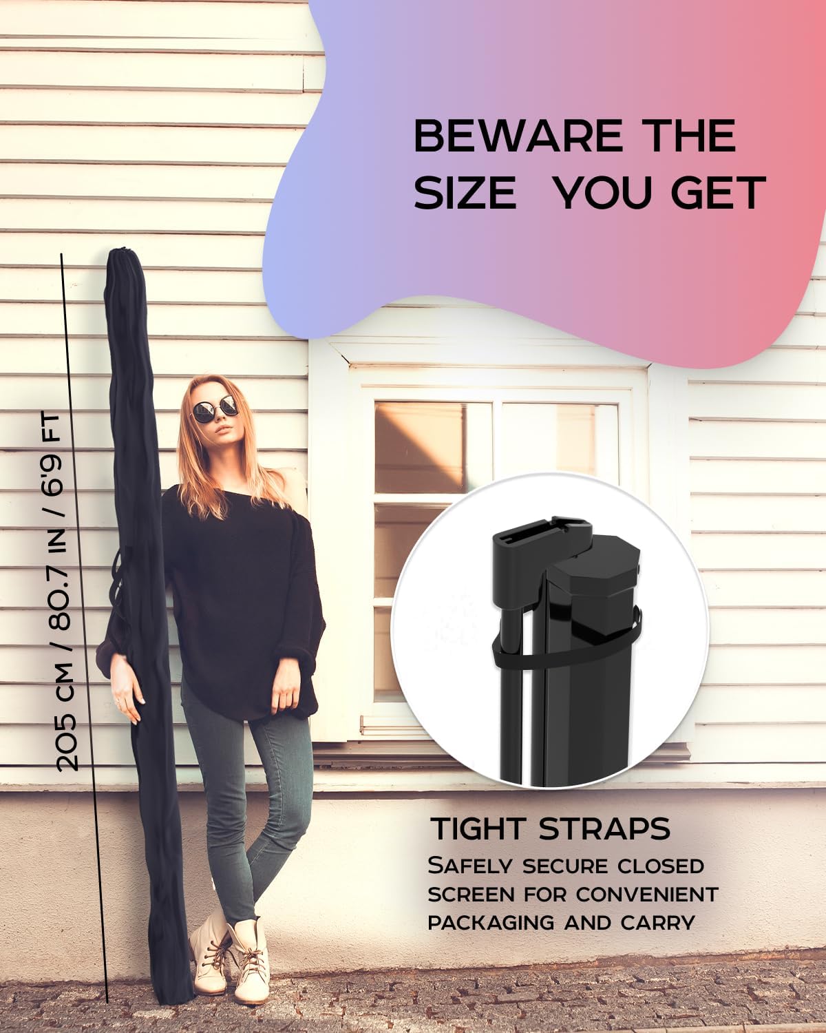 Indoor Outdoor projection movie screen is secured by convenient tight-straps, it could be carried to backyard or auditorium in a perfectly fitted projector screen bag, its retractable and adjustable design can be easily assembled in 3 steps