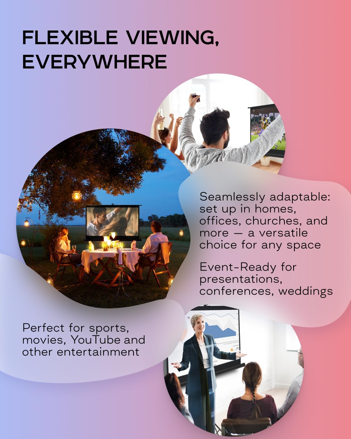 Viewing capacity enables usage in any places: home, school, office, church, classroom, backyard; on any venues: presentations, conferences, weddings, parties; for any entertainments: sport events, movies, TV shows, video games, youtube.
