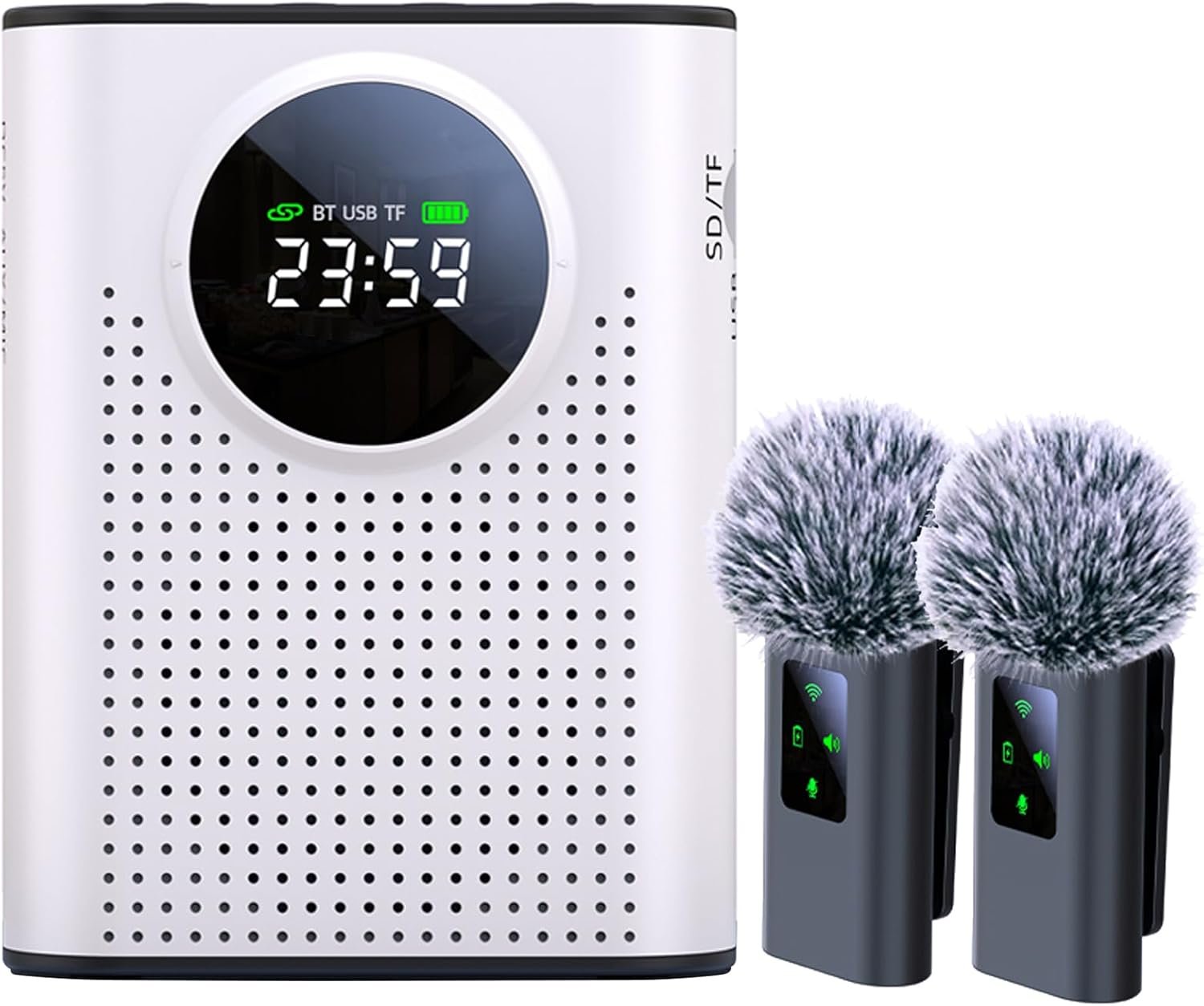 Rechargeable Voice Amplifier Wireless Microphone Dual for Teachers Classroom, Mini Lavalier Lapel Mic Clip Magnetic, Bluetooth Speaker with LED Display for Class, Tour Guide, Coaches, White