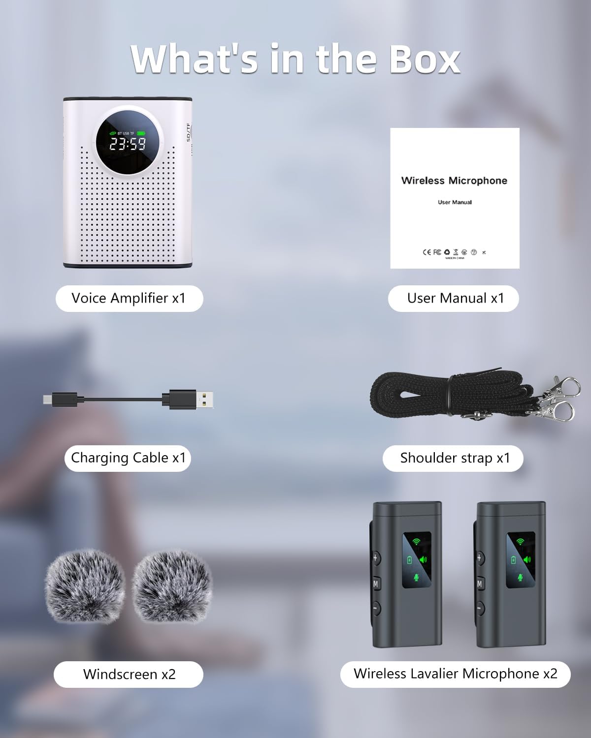 PACKAGE LIST: ZERFUN Voice Amplifier x1; Wireless Lavalier Microphone x2; Shoulder Strap x1; Windscreen x2; Charging Cable x1; User Manual x 1.