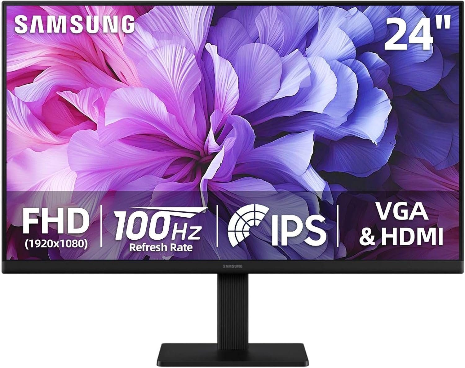Samsung S24 inch IPS FHD (1920×1080) Monitor, 100Hz Refresh Rate, 5ms, AMD FreeSync, Ergonomic Design, Eye Care, Flicker-Free, Game Mode, HDMI & VGA, Tilt Adjustment, Black
