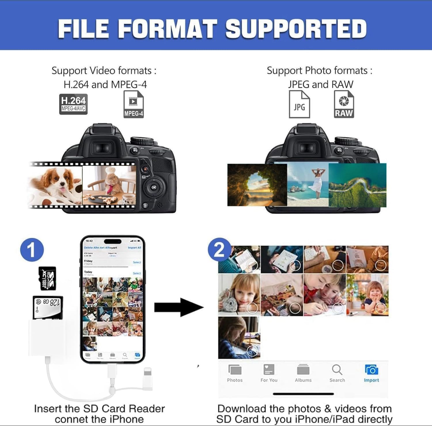 Wide Comapatibility: The Digital Camera card reader for iPhone is a great companion for Mac/MacBook and iPad Pro, and is compatible with iPhone 17/17 Air/17 Pro/17 Pro Max/iPhone 16/16 Plus/16 Pro/16 Pro Max/iPhone 15/15 Plus/15 Pro/15 Pro Max/14/14 Pro/14 Pro Max/13/13/13 Mini/13 Pro/13 Pro Max/12 Mini/12/12 Pro/12/12 Pro Max/11/XR/XS/X/8 /7/6/5, MacBook Pro/Air, iPad and more.