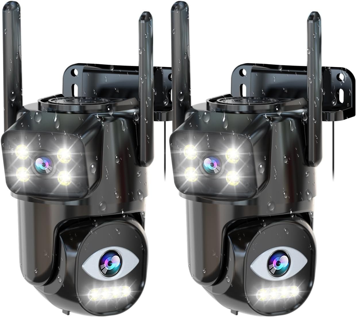 【1 Device = 2 Cameras,2K Ultra HD Resolution & Color Night Vision】Security Cameras Wifi Outdoor has two lens. 2 lens view cover 360°,Each lens is 3MP/2K with sharper colors and details, allowing you to see everything that is happening within your surveillance area. One camera but function as 2. The camera is built-in 8 leds, the light could be set to motion triggle on or always on at night or close,and when the lights are on at night, extraordinary color night vision adds a glow to every dark night.