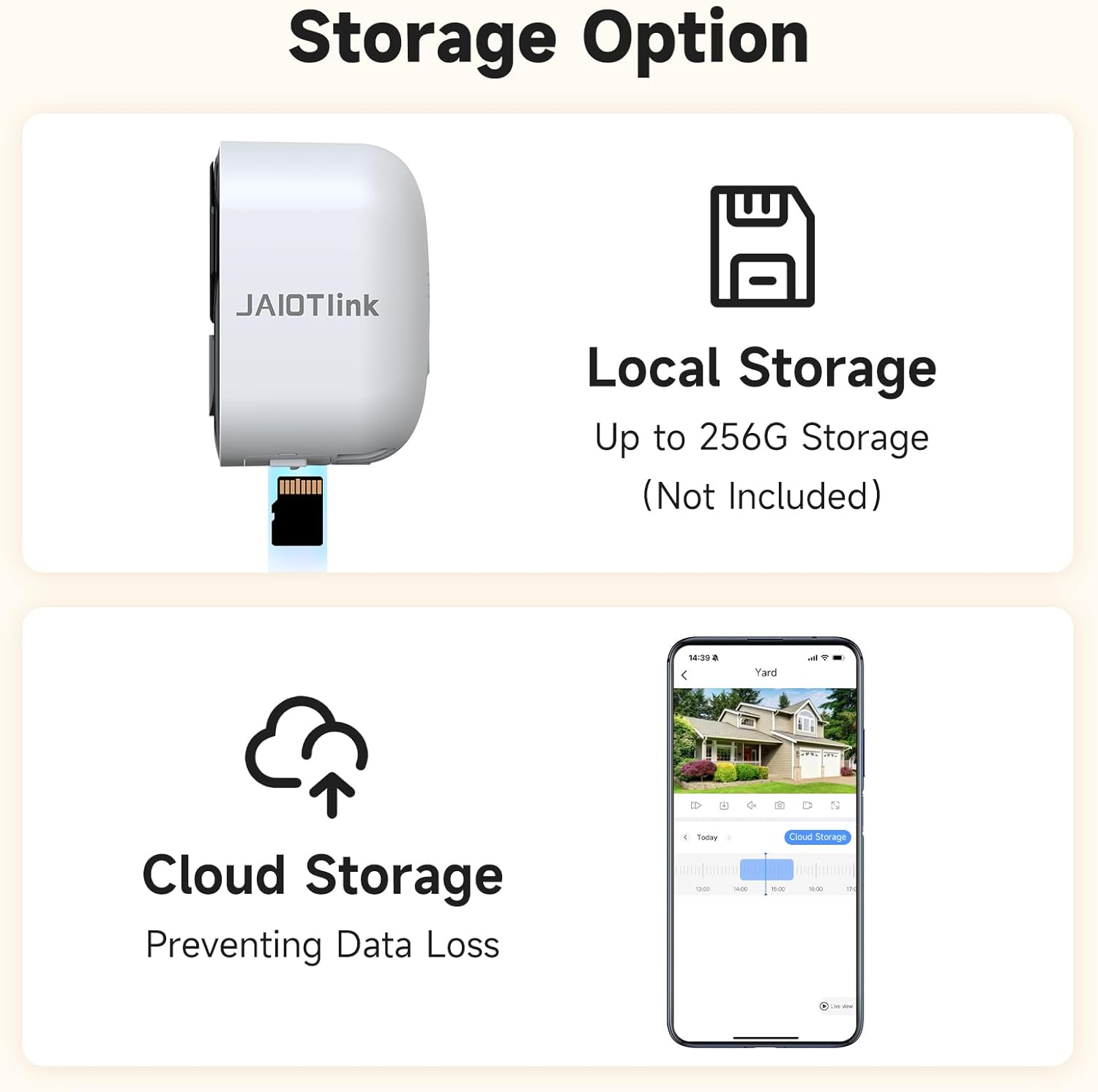 Flexible Dual Storage Options: This wireless outdoor camera supports up to 256GB local SD card storage for direct event recording—no need for frequent card replacement. Optional cloud backup adds a second layer of protection, ensuring your footage is always safe, secure, and easily accessible anytime, anywhere.