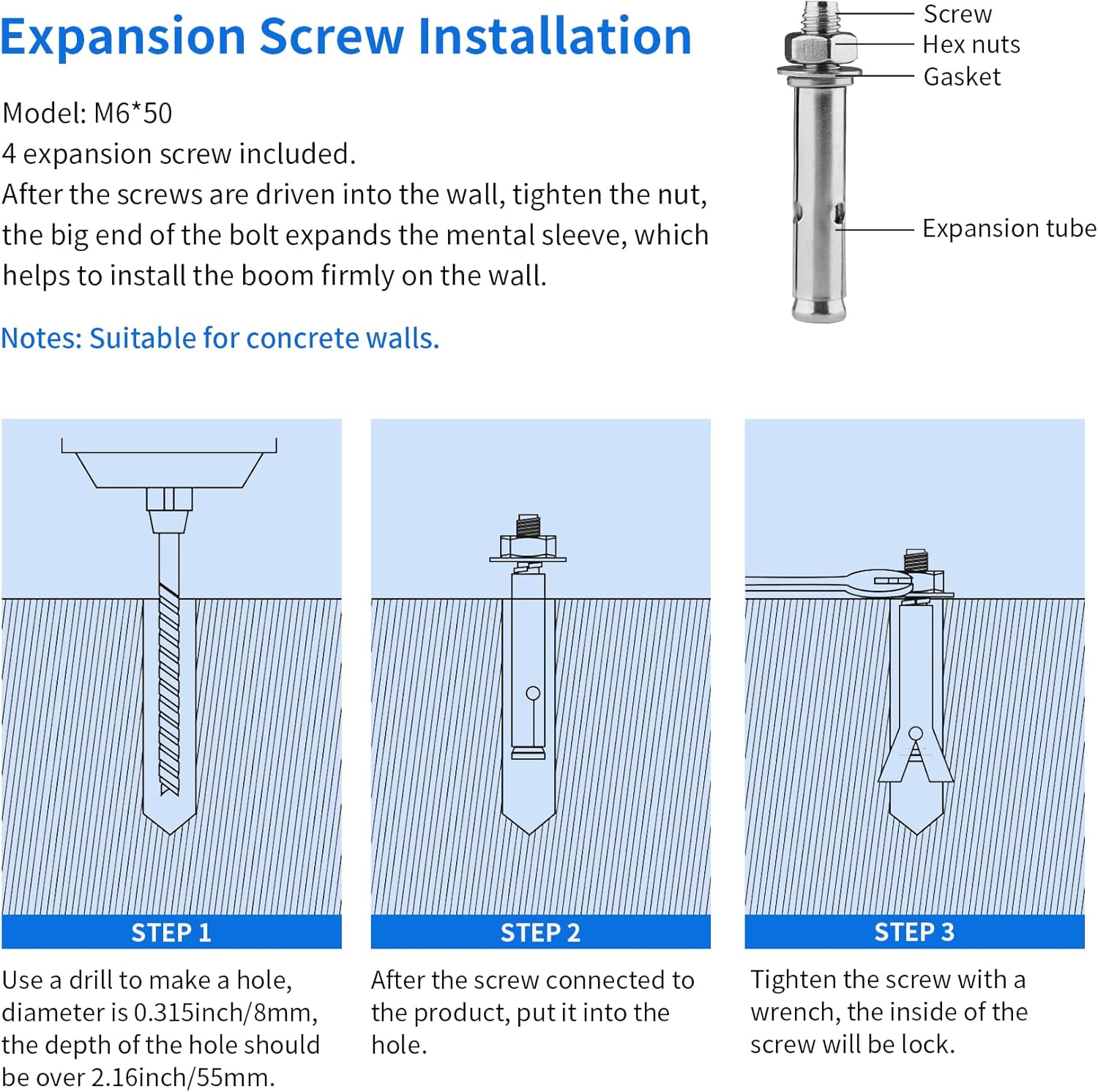 Note: Please make sure to mount this boom arm on load-bearing wall.