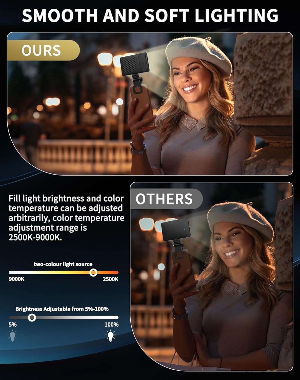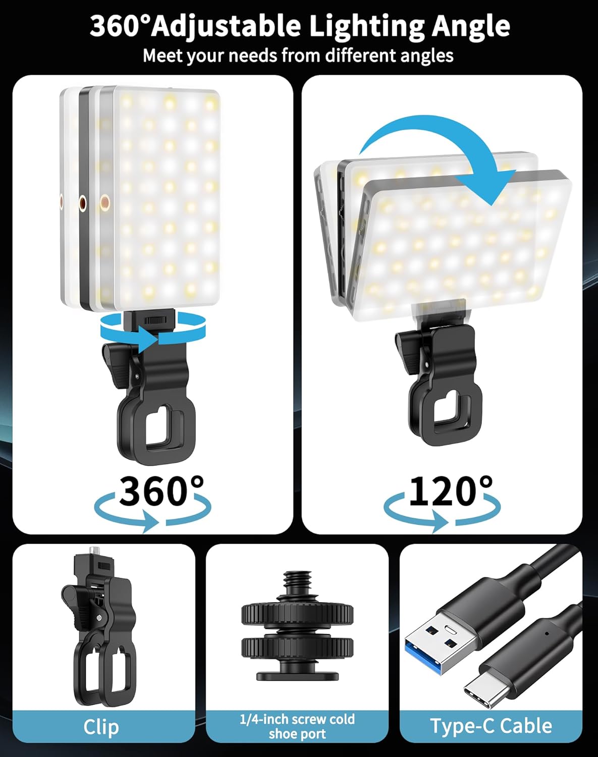 120 LEDs with Stepless Adjustments: The 120 LEDs phone light clip , divided into 60 white and 60 yellow LEDs, provide excellent lighting quality. The ability to adjust the brightness from 5% to 100% is good. The light for phone allows you to create soft lighting in any situation
