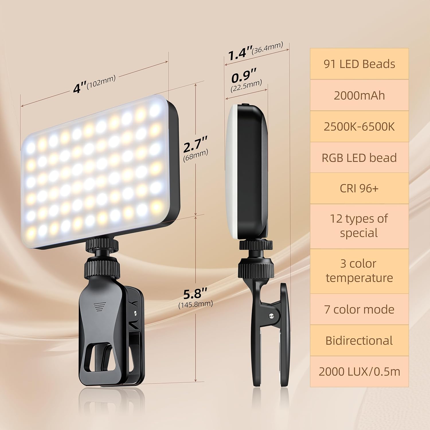 ULTRA-BRIGHT 91 LED PANEL: High Color Rendering Index selfie light with slim LED beads, 3 light modes & 10 brightness levels, color temperature adjustable for flawless makeup, selfies, vlogging