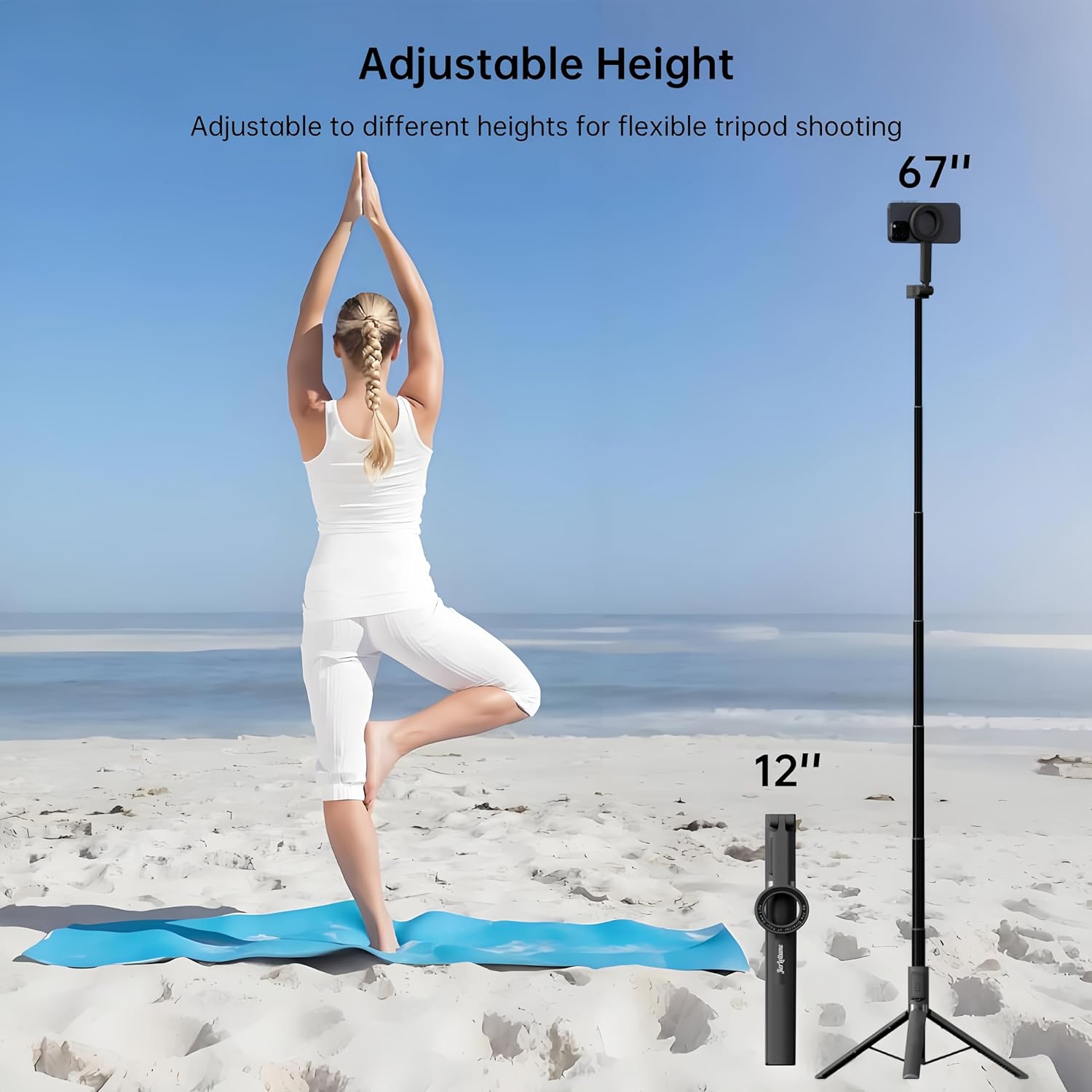 [𝟏𝟐”-𝟔𝟕” 𝐅𝐮𝐥𝐥-𝐒𝐢𝐳𝐞 𝐓𝐫𝐚𝐯𝐞𝐥 𝐓𝐫𝐢𝐩𝐨𝐝] 7-section aluminum poles provide seamless height adjustment (12″-67″), fit in backpacks when folded, extend to 67″, ideal height for desk vlogs, outdoor landscapes, and long-range shots. Non-slip feet adapt to various terrains—empowering limitless creativity. Shoot smarter, shine brighter. The perfect magnetic selfie stick tripod for iPhone users seeking versatility