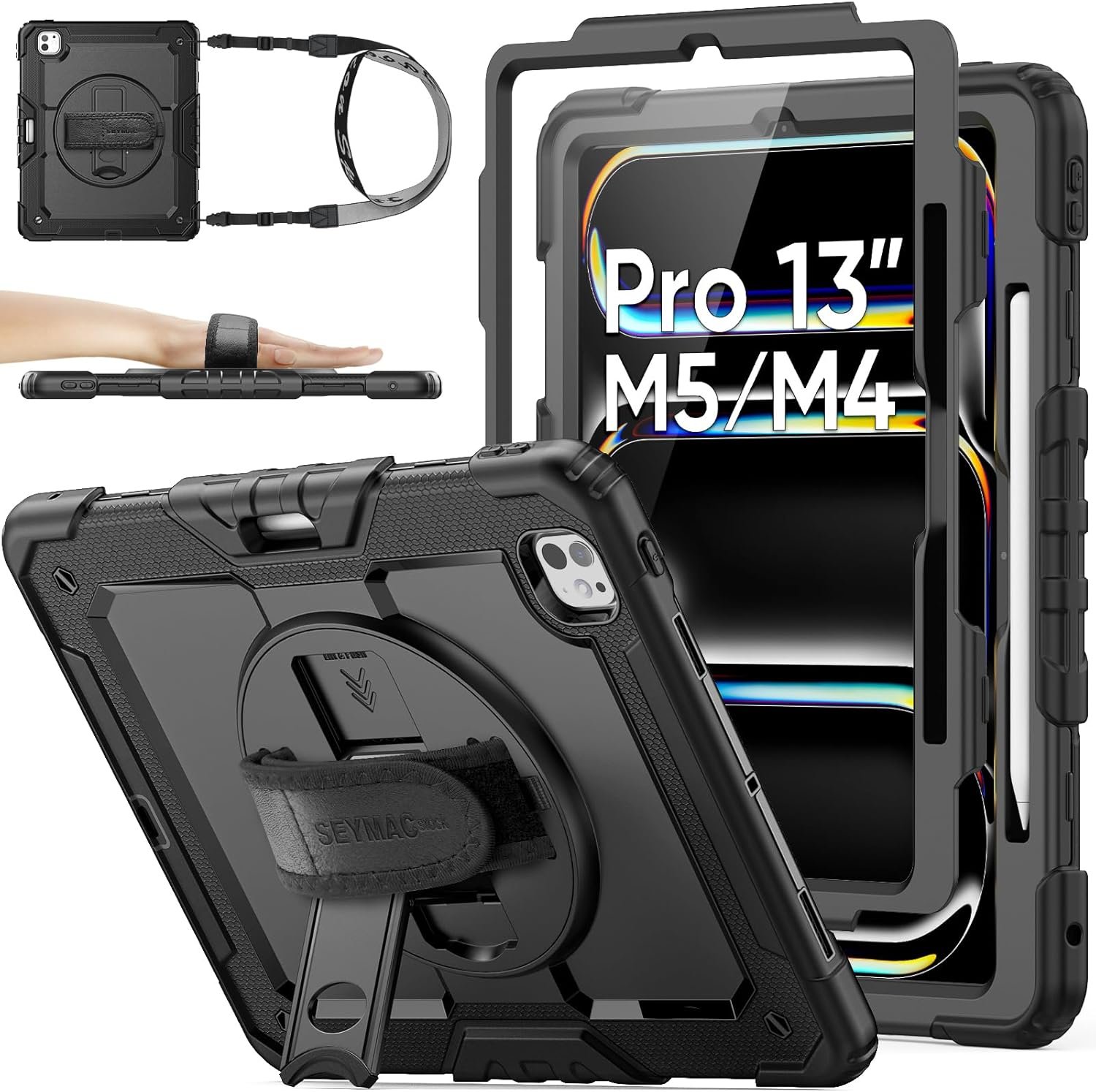 SEYMAC stock for iPad Pro 13 inch Protective Case M5 2025/M4 2024, Heavy Duty Case with Screen Protector, Pencil Holder, Rotating Stand, Hand Strap, Shoulder Strap, Black