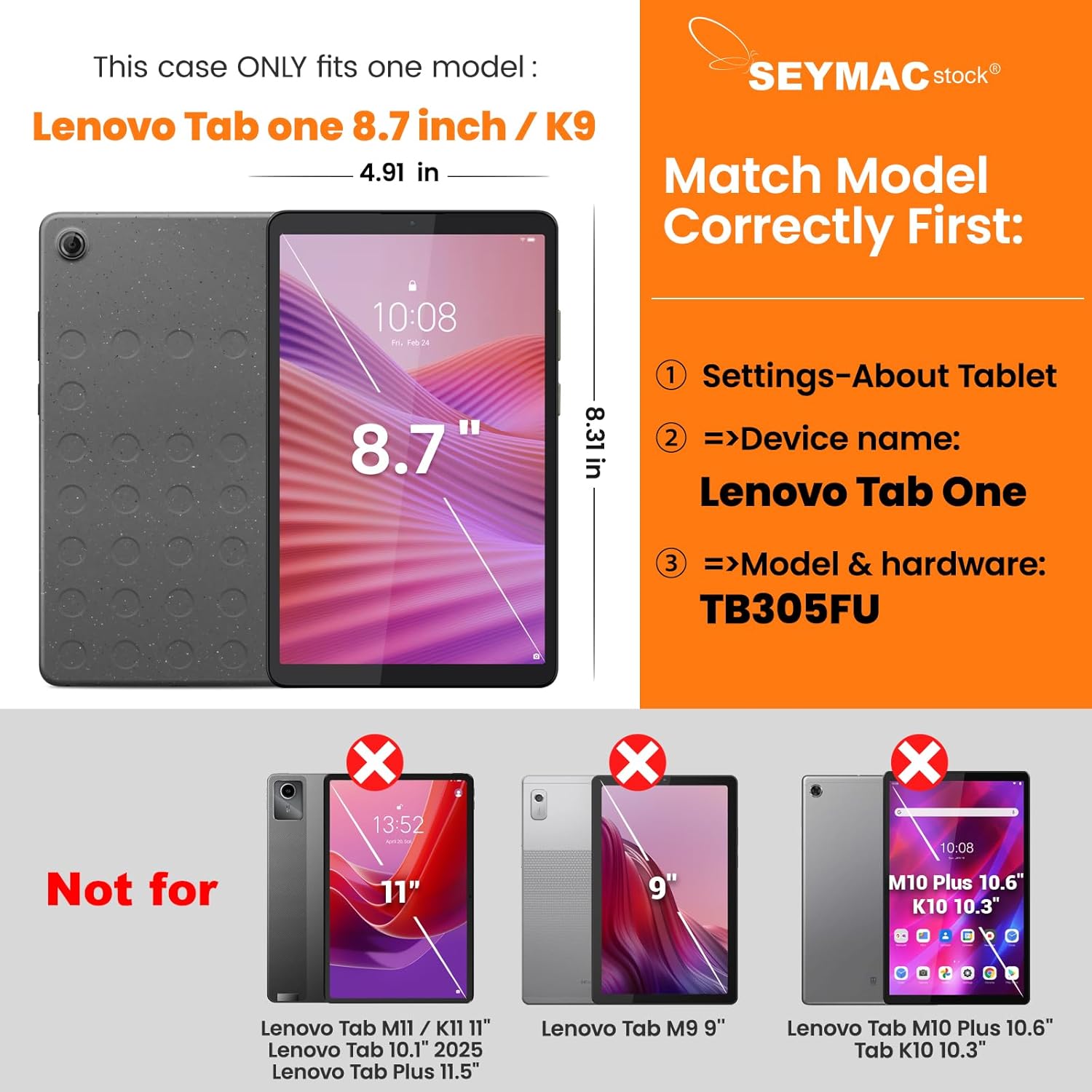 Compatibility: ONLY Compatible with Lenovo Tab One 8.7 inch / Tab K9 2025 Released. (Model: TB305FU). NOT fits for Tab K10 10.3” or M9 9” (Incompatible model: TB-X606F/TB-310FU). Please confirm models: “Settings-About Tablet-Model” before purchase
