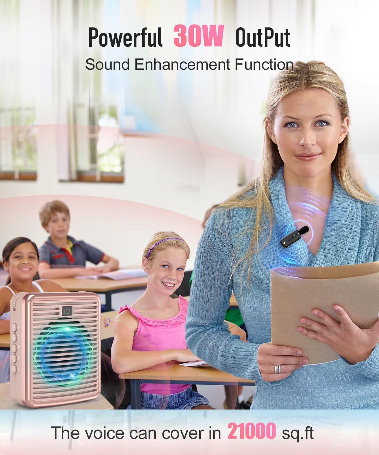 Powerful Voice: The Bluetooth amplifier delivers crystal-clear, distortion-free audio with a strong 30W output, , Amplifies your voice and saves your throat when you have a difficult time speaking loudly enough.The voice amplifier can cover about 21000 sq.ft (2000 ㎡), allowing up to 250 students to hear you clearly
