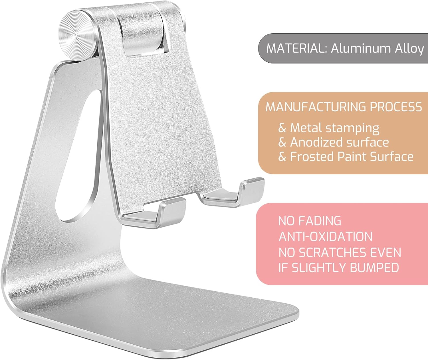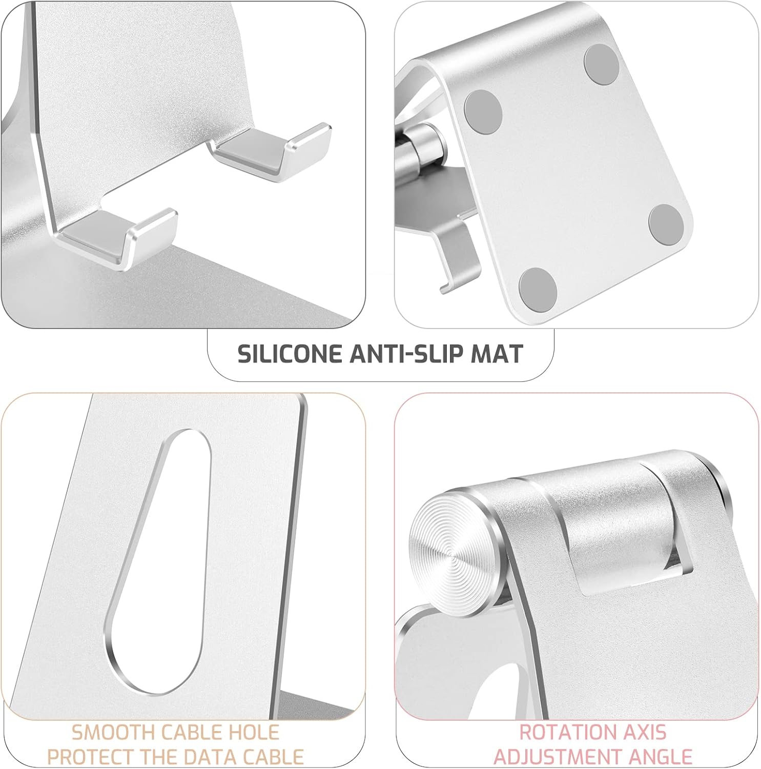 Silver Foldable Aluminum Alloy Cell Phone Holder,Tabletop Metal Phone Stand with Adjustable Angle by Swivel Axis,Smartphone Cradle