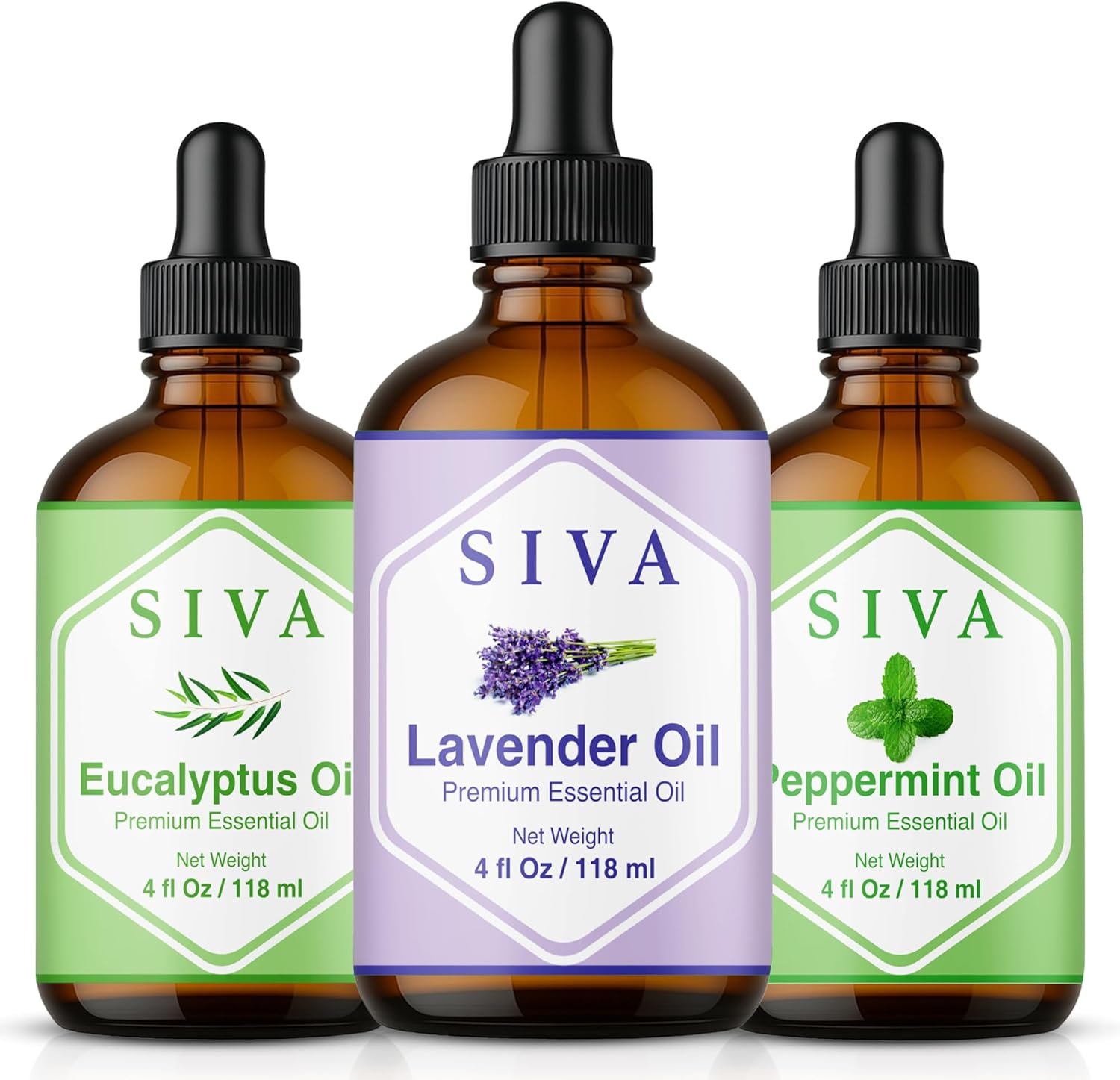 Siva Lavender Essential Oil, Peppermint Essential Oil and Eucalyptus Essential Oil 4oz Bundle Super Saver Combo – Premium Grade Value Set for Aromatherapy, Scalp Massage, Hair Care, Skin & Body