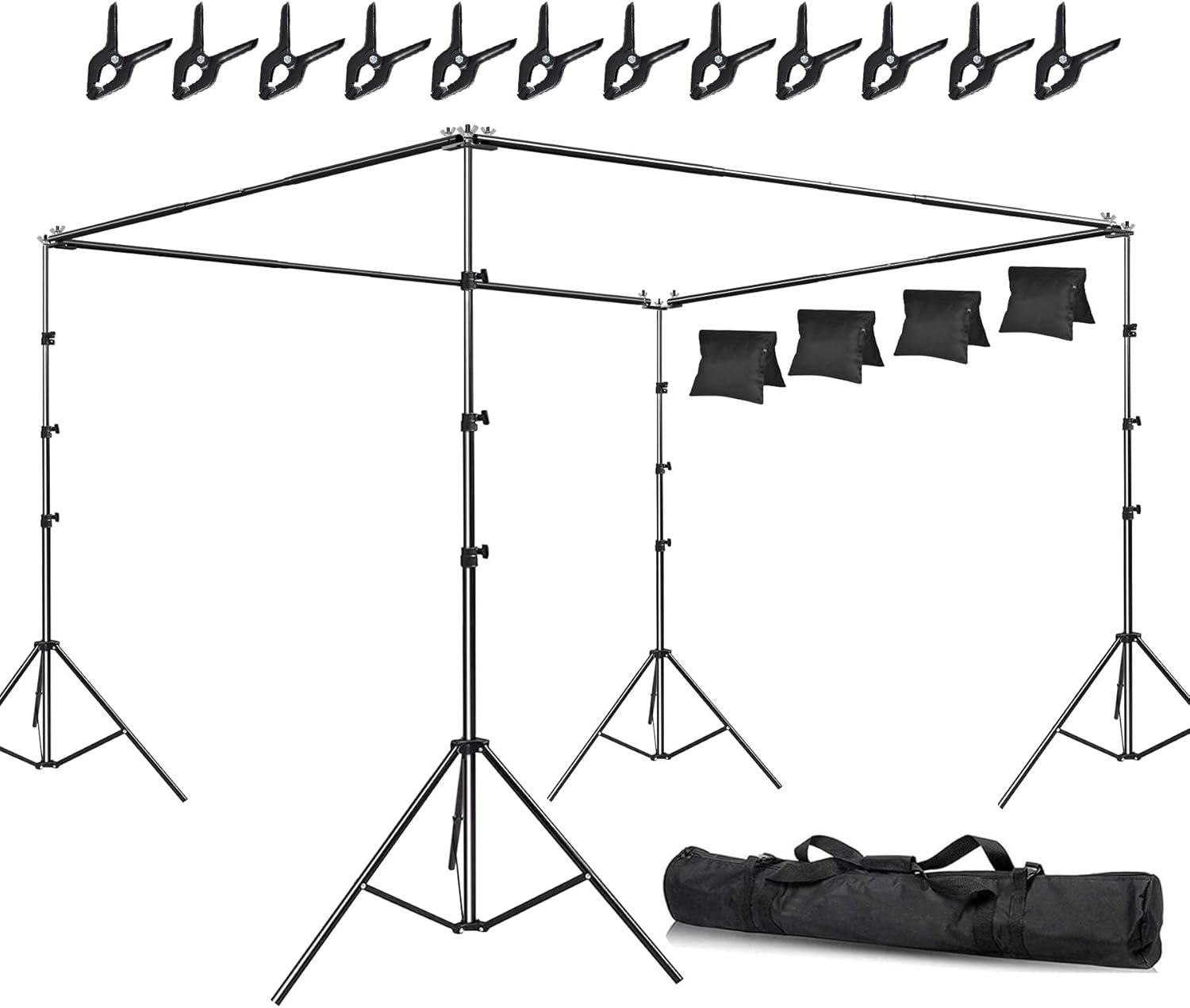 Package Includes: 4 x Heavy Duty Telescopic Crossbars: 8pcs-Interlocking Bars (40 FT) / 4 x Heavy Duty Light Stands (8.5 FT), / 4 x 300° Angle Adjustable Crossbar Connector / 4 x wing nut / 12 x heavy duty spring clamps/ 4 x Sand Bags/1 x Carry Bag