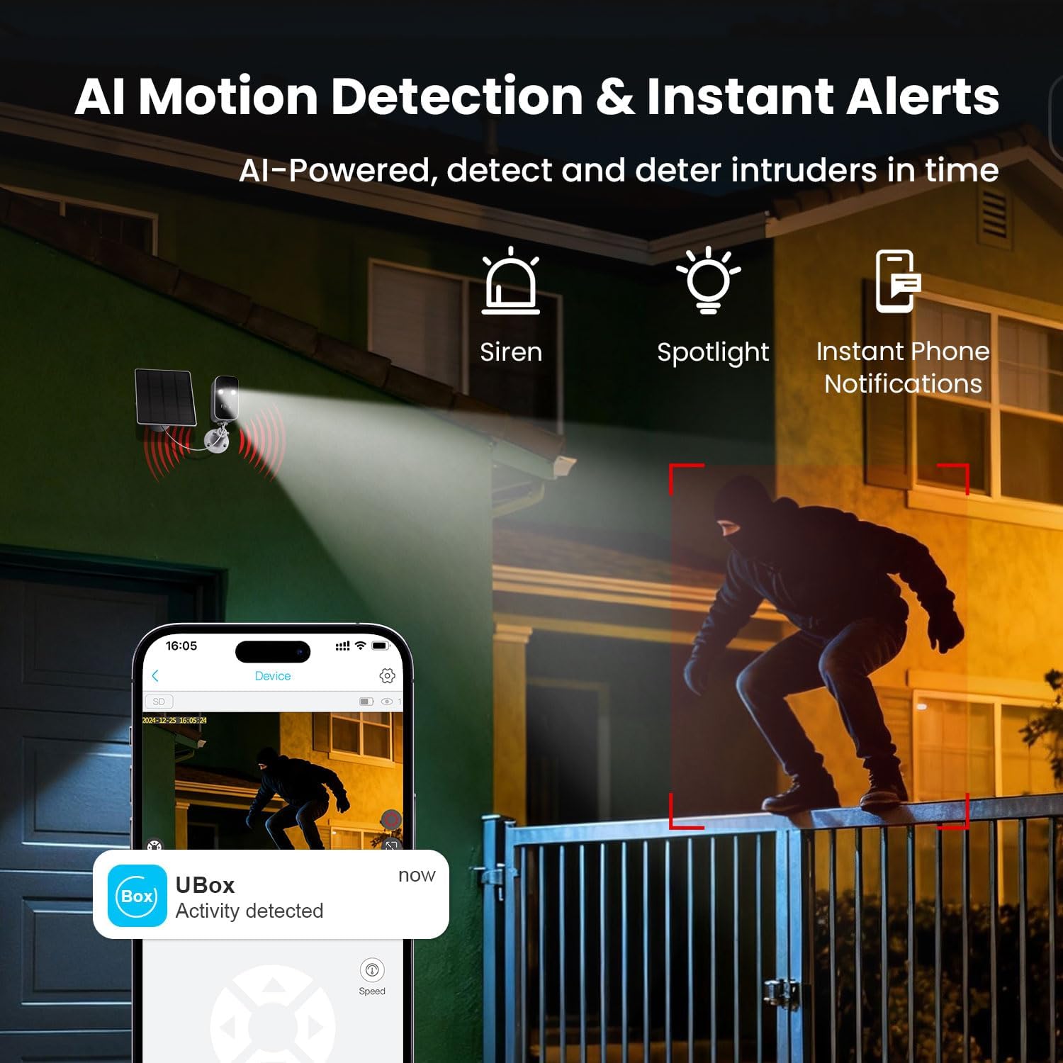 AI Motion Detection & Timely Warning: When the professional PIR sensor detects motion, the wifi solar camera quickly emits a spotlight or sounds the siren to intimidate intruders. While an instant phone notification is pushed, which lets you always be in the know.