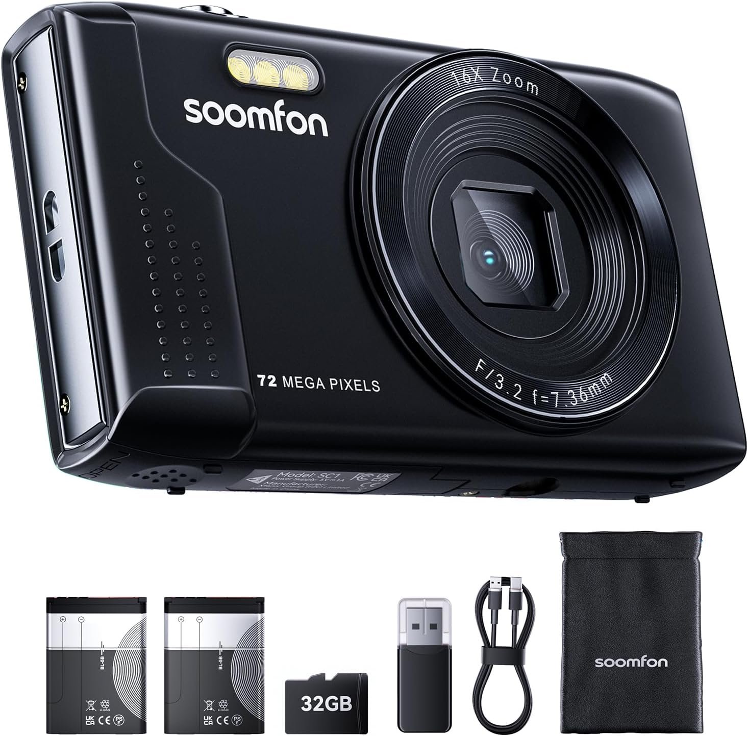 SOOMFON Digital Camera – Max 72MP & 4K Point and Shoot Kids Cameras with 16X Zoom, 32G TF Card, 2 Batteries and Card Reader, Compact Digital Camera for Kids Teens Beginners (Black)