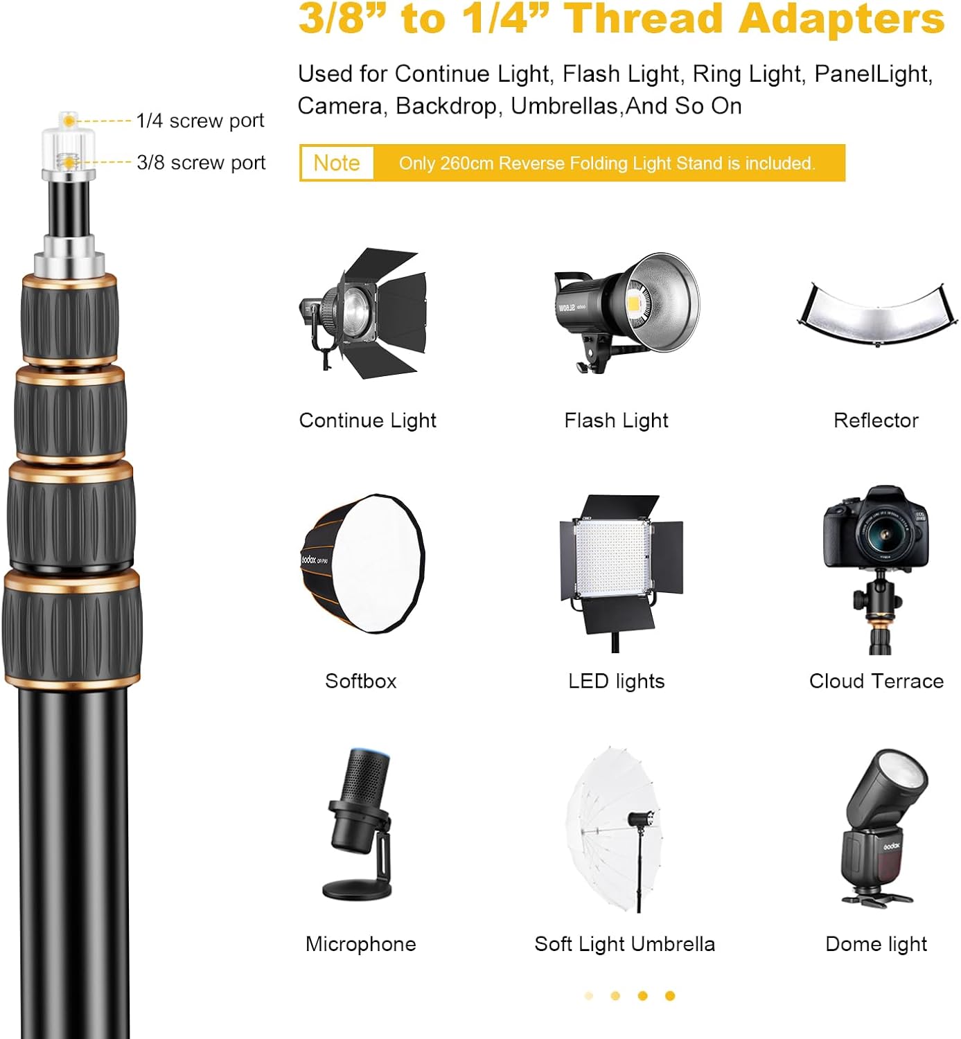 【Lightweight & Potable】 The light stand is made of alumium alloy, the tripod is easy to carry around for outdoor photography lighting and video recording. and It is strong enough, Maximum load capacity 5kg/11 lb, Tube diameter:16-19-22-26-28mm.