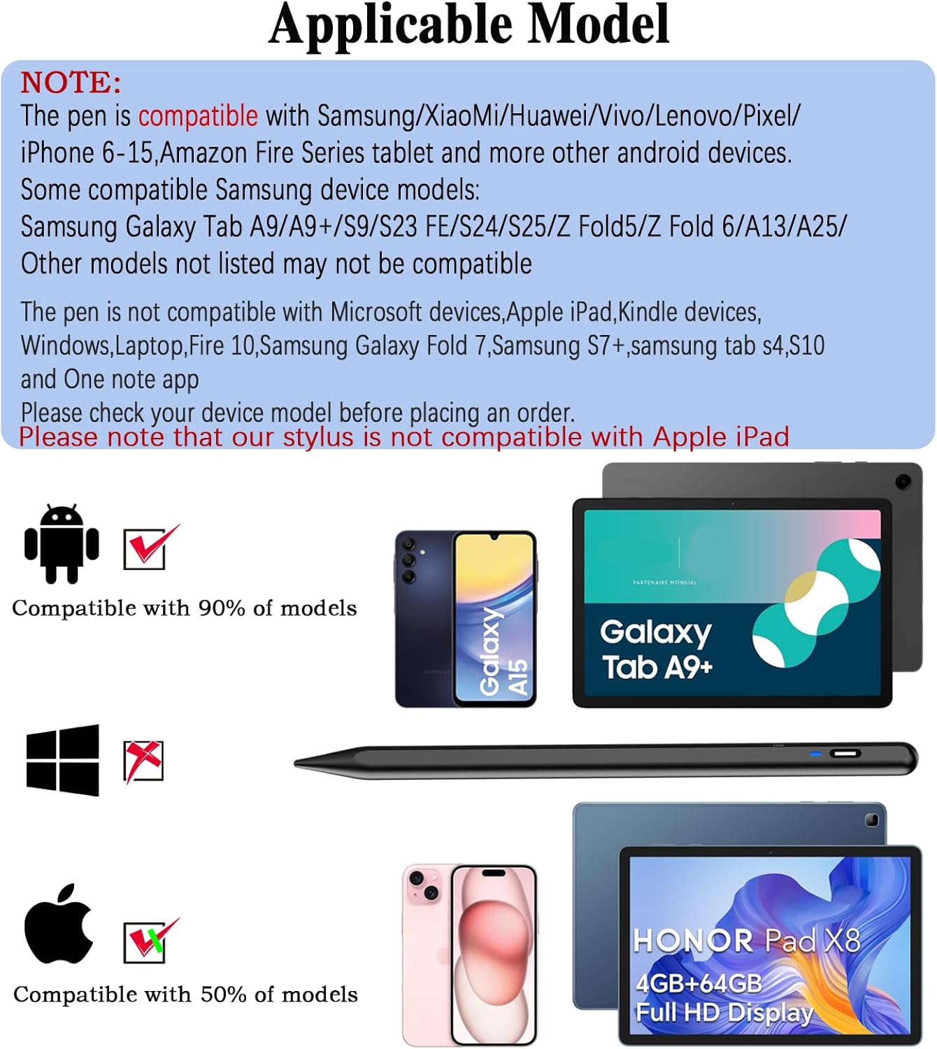 【Wide Compatibility】-This stylus pen for touchscreen is for capacitive screen electronic product and is specially designed for Android device on the market.The iphone stylus pen is suit with Samsung/XiaoMi/Huawei/Vivo/Lenovo/Pixel/iPhone 6-15 ,Amazon Fire Series tablet and other android device. Some compatible Samsung device models-Samsung Galaxy Tab A9/A9+/S9/S23 FE/S24/S25/Z Fold5/Z Fold 6/A13 /A25/ (Note: This lenovo pen is not compatible with Microsoft devices,Apple iPad,Kindle devices,Windows,Laptop,Fire 10,Samsung Galaxy Fold 7,Samsung S7+,samsung tab s4,S10,A10 and One note app. Please check your device model before placing an order.Please note that our stylus is not suit with iPad.