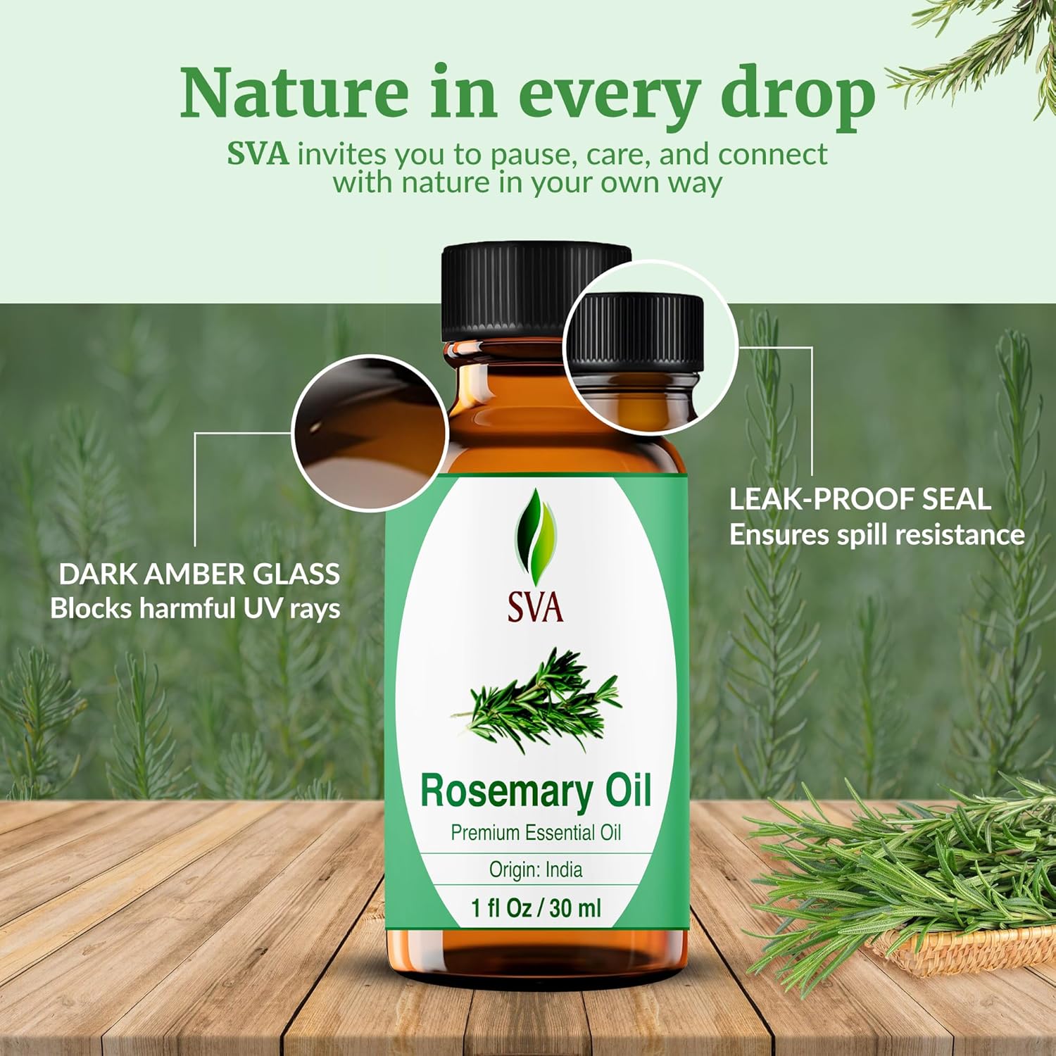 SVA Rosemary Essential Oil – 1 Fl Oz – 100% Natural Rosemary Oil for Hair, Face, Skin Care, Diffuser, Aromatherapy, Scalp, Body Massage, Soap and Candle Making – with Dropper