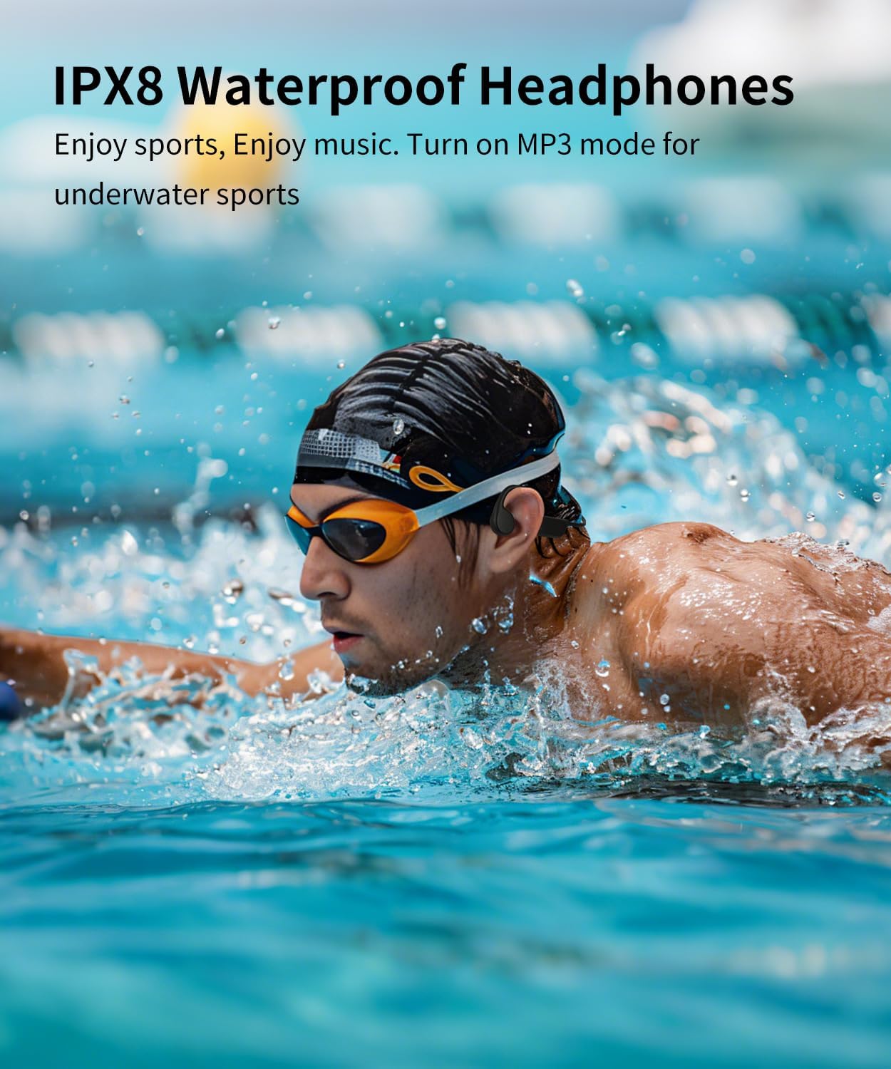 MP3 and Bluetooth Dual Mode – Waterproof swimming headphones with 32GB of built-in storage, turn on MP3 mode and enjoy 9,000 of your favorite songs or audiobooks. In MP3 mode, press the power button three times to switch between sequential and random playback.