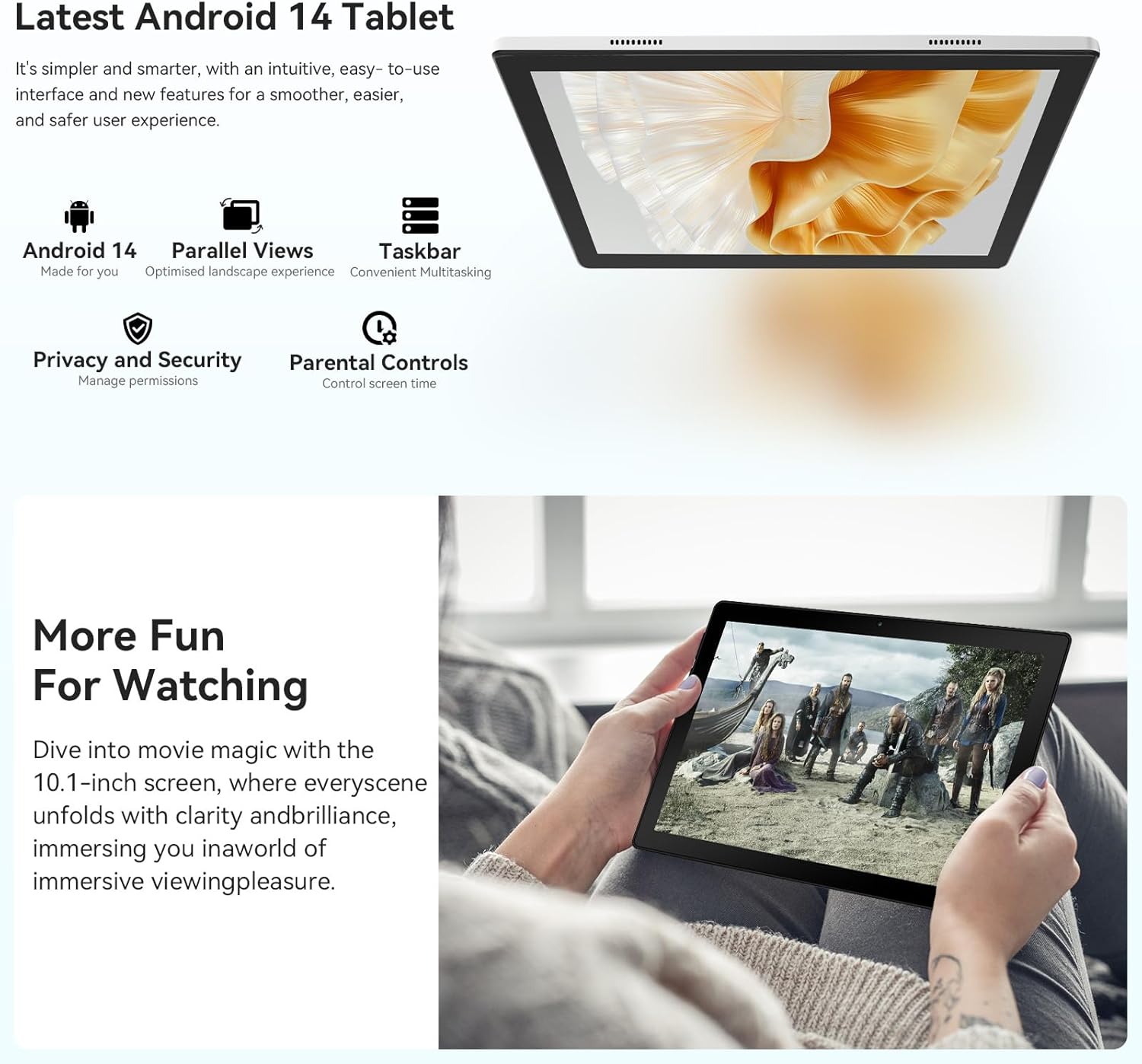Android 14 & Enhanced Security:The Android 14 tablet offers enhanced privacy controls, security features include facial recognition unlock, app permission manager, and encrypted folder protection. Our Android tablet access to a large of apps on Play Store. Pre-installed apps like YouTube and Gmail integrate seamlessly for everyday use
